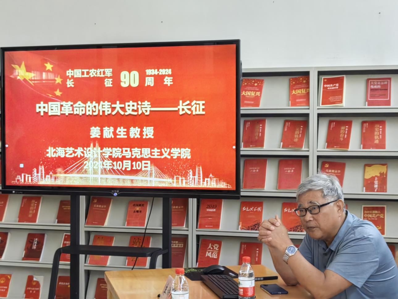 10月10日下午5:00,在众多师生的期待下,红色专题知识系列讲座在图书馆三楼“红色阅读角”如约拉开帷幕,由马克思主义学院院长姜献生教授专题讲授。(张家梅摄)