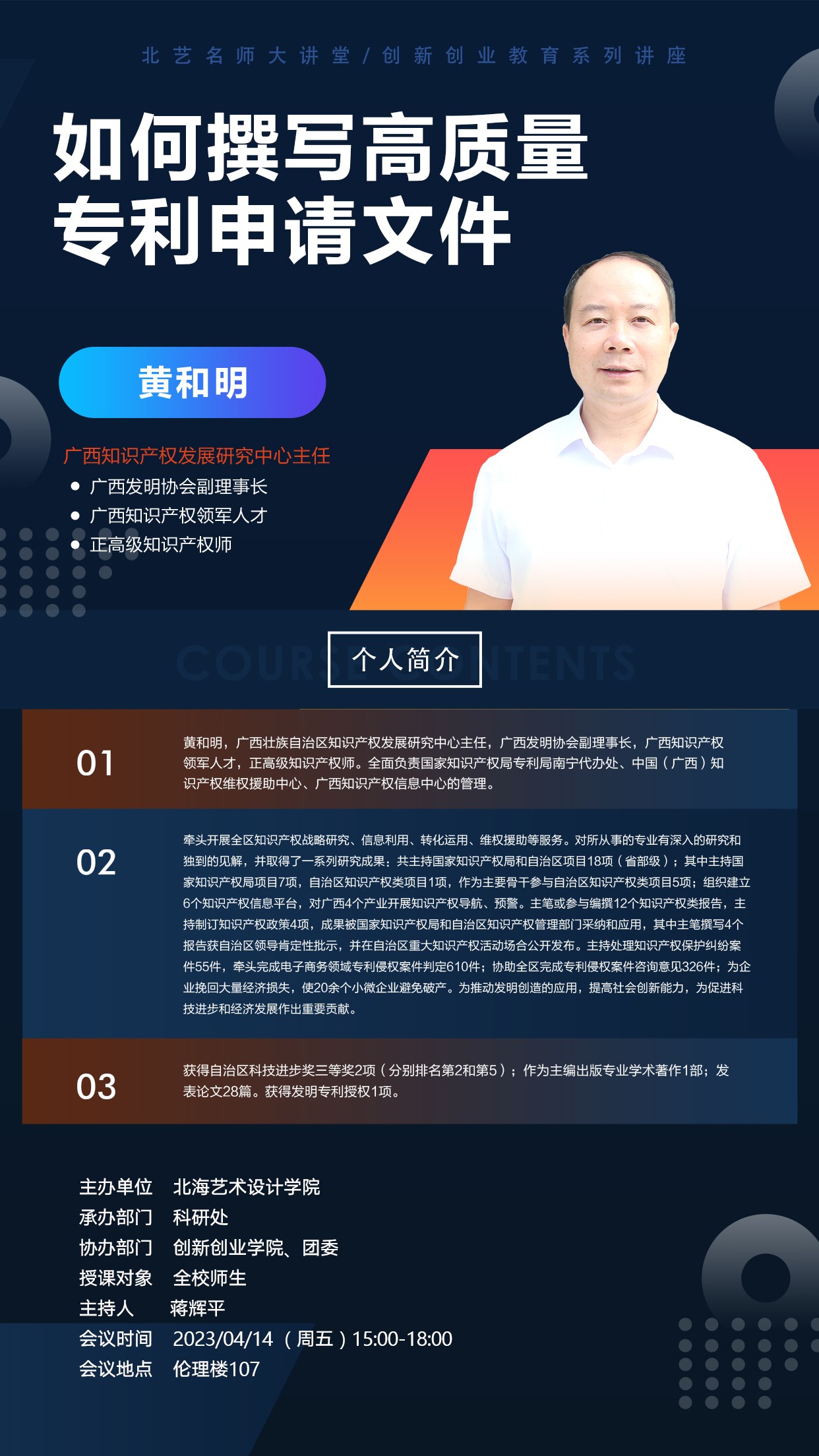 黄和明,广西壮族自治区知识产权发展研究中心主任,广西发明协会副理事长,广西知识产权领军人才,正高级知识产权师。全面负责国家知识产权局专利局南宁代办处、中国(广西)知识产权维权援助中心、广西知识产权信息中心的管理。