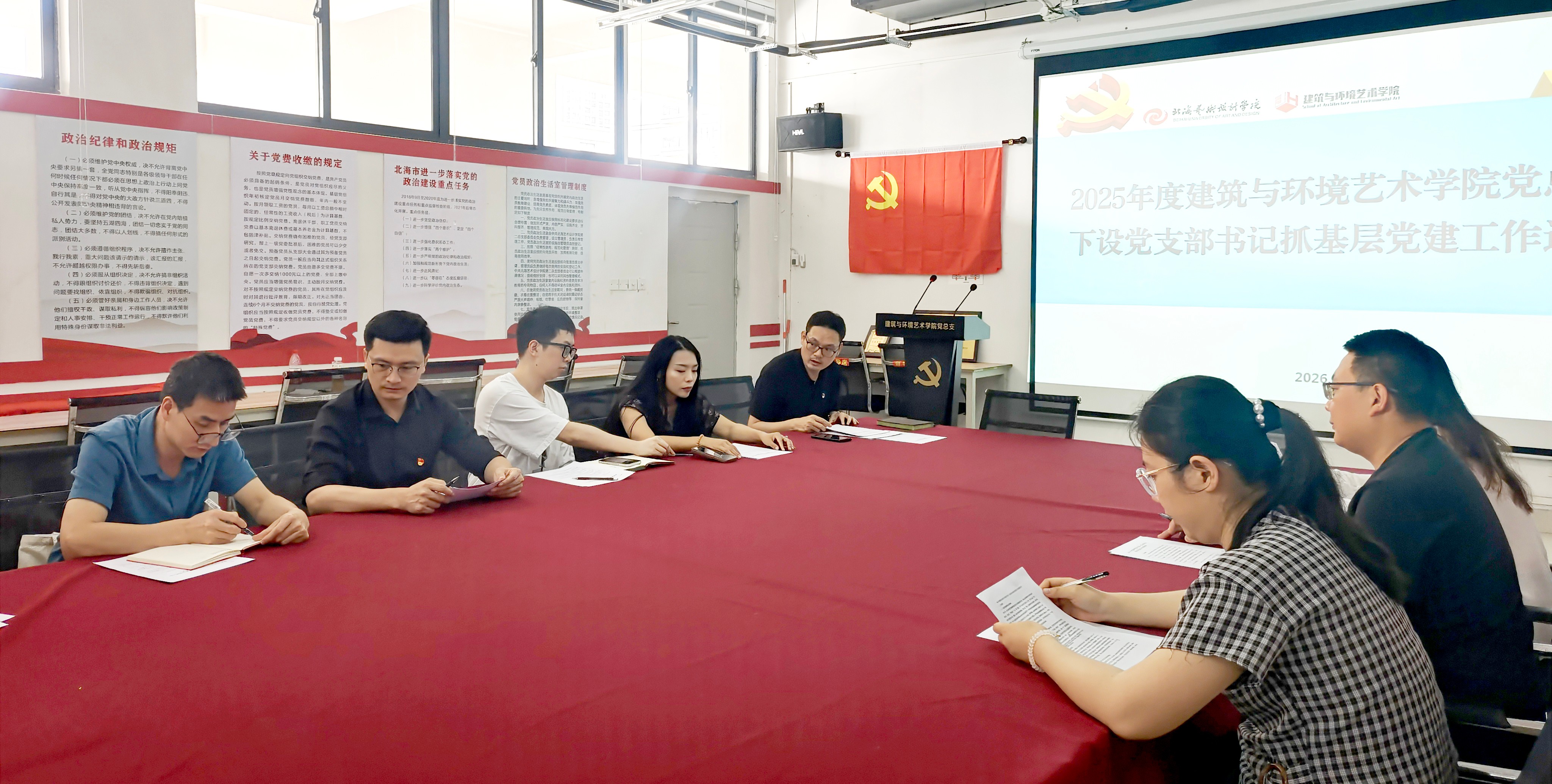 为推进学院党建工作高质量发展,2026年4月9日上午10:30,中共北海艺术设计学院建筑与环境艺术学院党总支委员会在公德楼507召开“2025年度建筑与环境艺术学院党总支下设党支部书记抓基层党建工作述职报告会”。本次会议由第二党总支书记庞定坤主持,参会的总支委员、党支部书记及党员代表共计11人。
