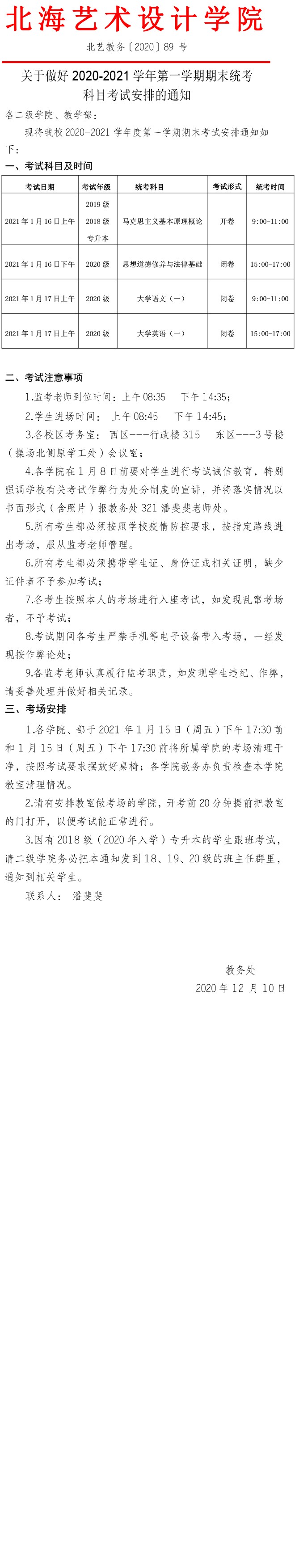 关于做好2020-2021学年第一学期期末统考科目考试安排的通知