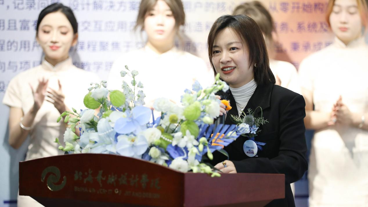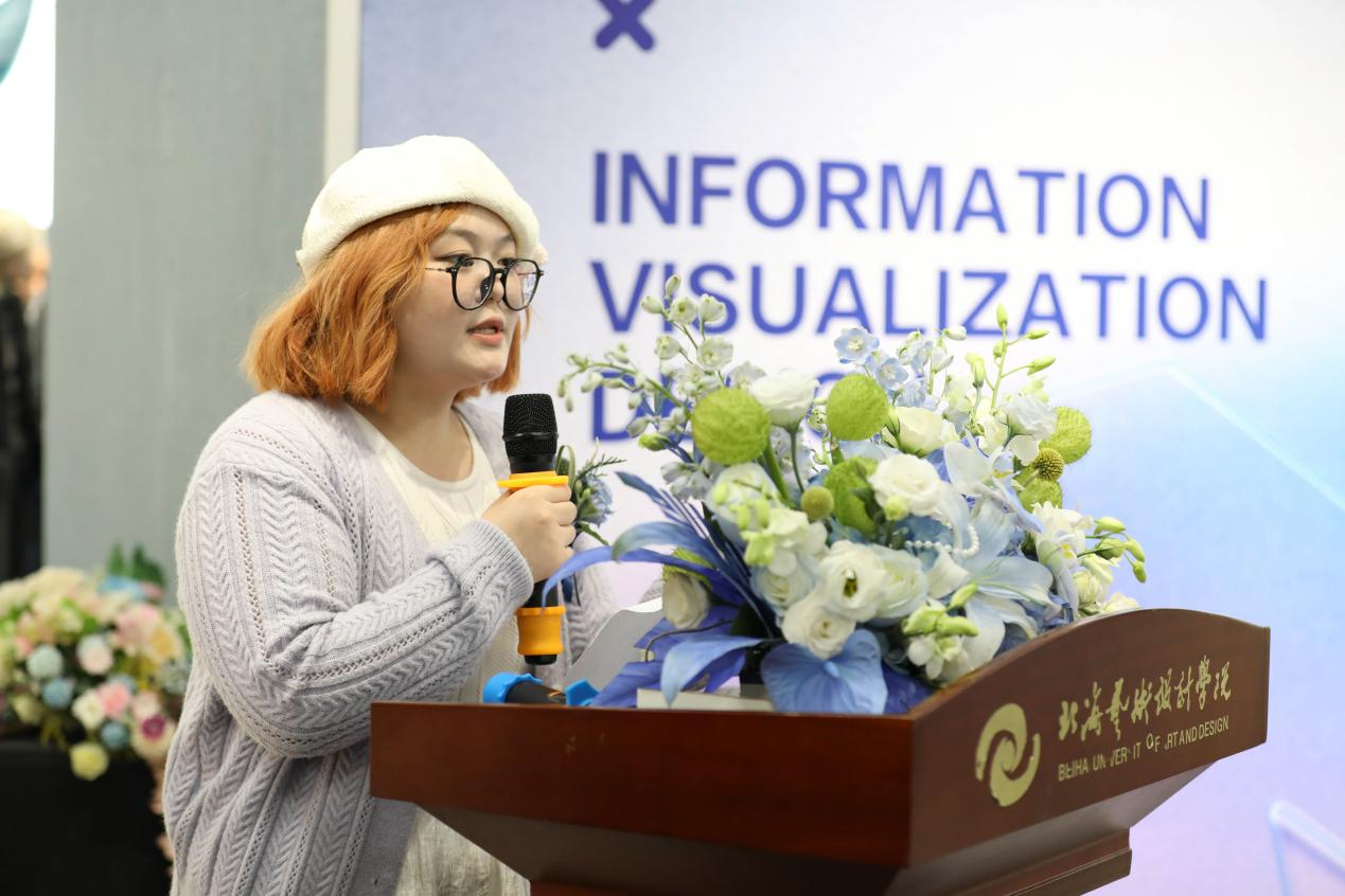随后,学生代表李钦上台发言。她满怀激情地分享了自己在《信息可视化设计》课程中的学习经历。李钦提到,这门课程让她学会了如何将复杂的数据转化为直观、美观的图形,让数据“说话”。这个过程不仅锻炼了他的逻辑思维和创意能力,更让她深刻体会到数字媒体艺术在信息传播中的巨大潜力。