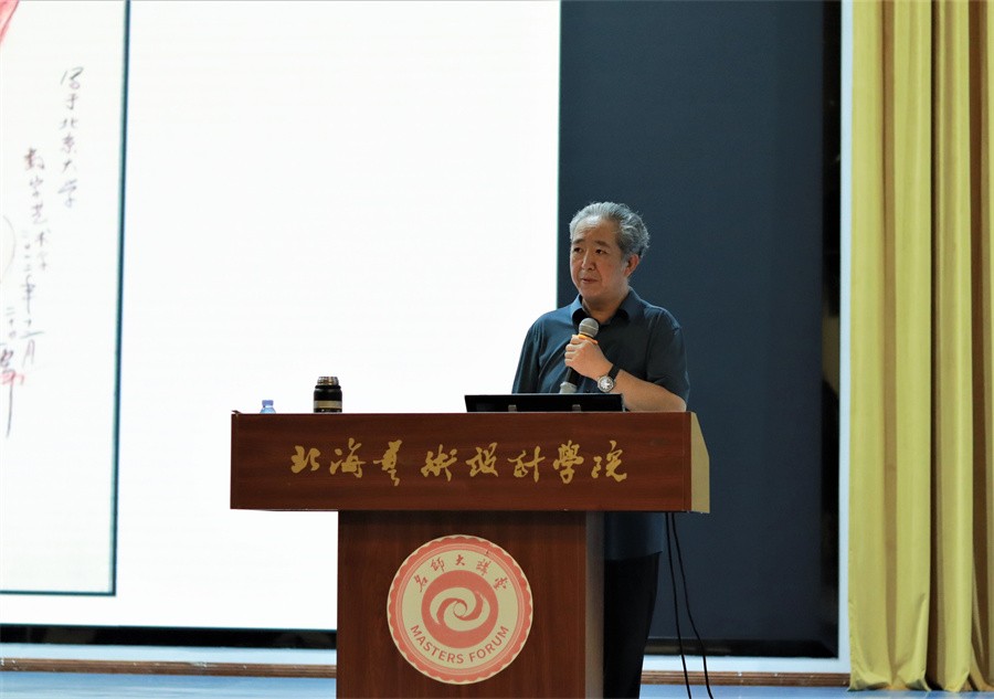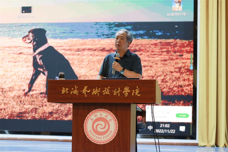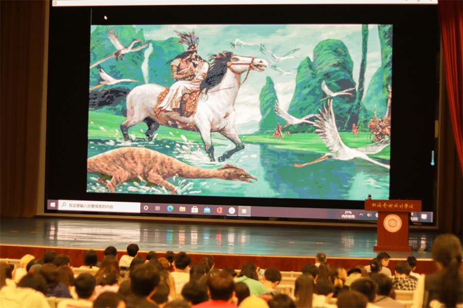 王伟教授播放《红山·龙》的场景概念图、50米电影概念场景设计长卷、角色造型设计图,说明未来的艺术是靠想象力、“数字”是工具,“艺术”是内涵。他鼓励同学们保持想象力,利用技术的手段展现无尽的想象力。