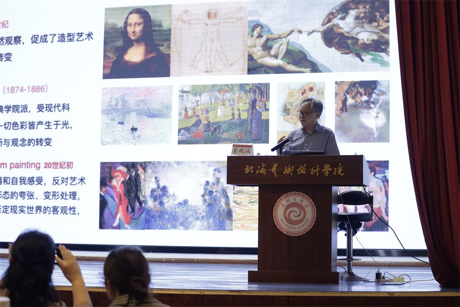 鲁晓波教授列举了达芬奇、爱因斯坦、李政道等艺术科技融合理论的重要人物事例,明确智能时代要进行人文、科技深入融合的艺术创新。他还分别从文艺复兴时期产生的艺科结合画作、自然与科学融合发展的趋势、奥运会动态标志的产生,AI3D绘画的应用等艺术与科技相辅相成共同发展的实例,指出“艺术,不会也不可能被终结”的概念,展现了艺术发展的无限可能,让在场的师生看到了艺术发展的勃勃生机。