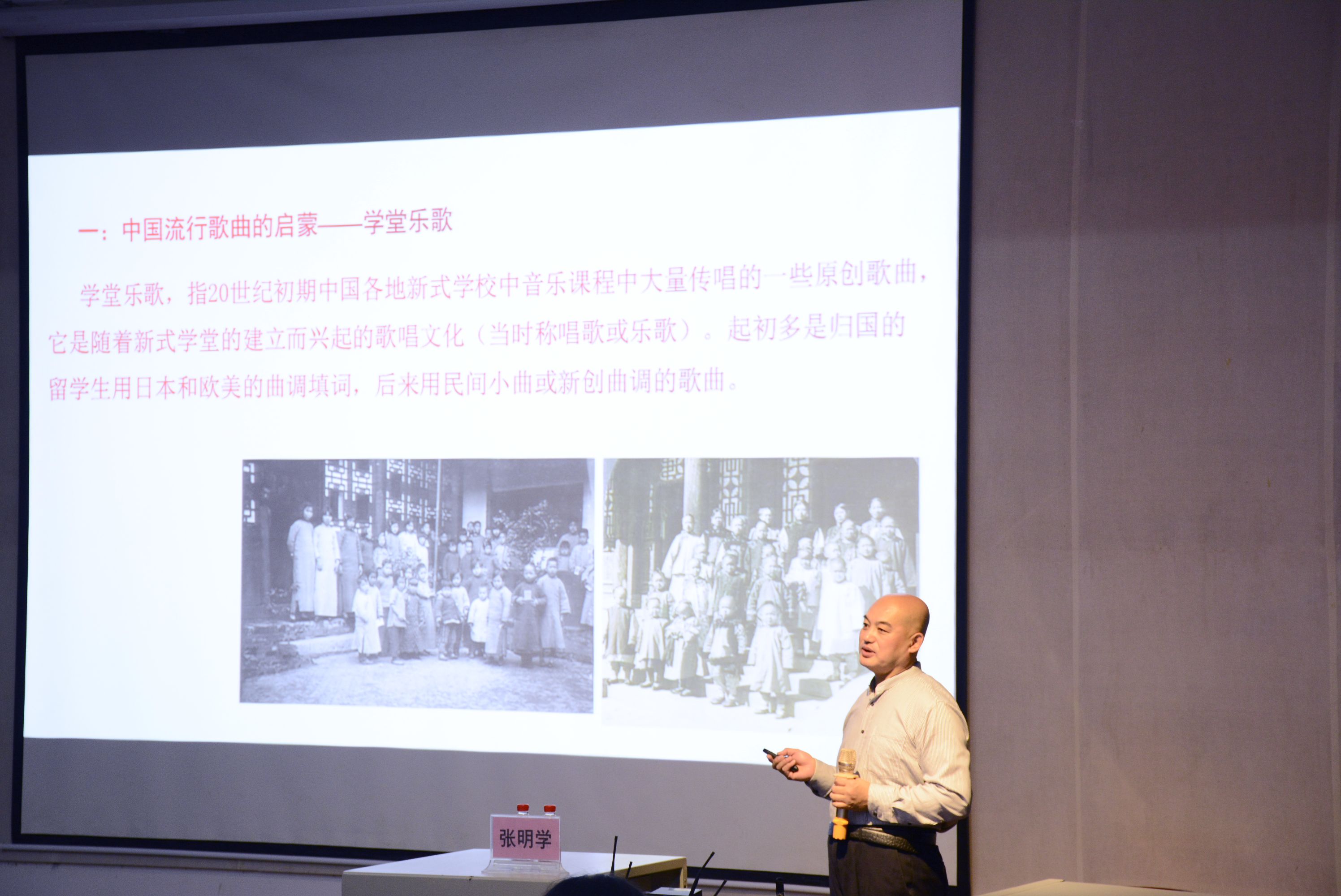 讲座伊始,张教授与大家亲切交流,由自身经历引出中国流行歌曲的启蒙——学堂乐歌的来历。张教授指出,学堂乐歌虽然借鉴了西方的音乐形式,但在内容与精神表达上契合当时的时代精神追求。