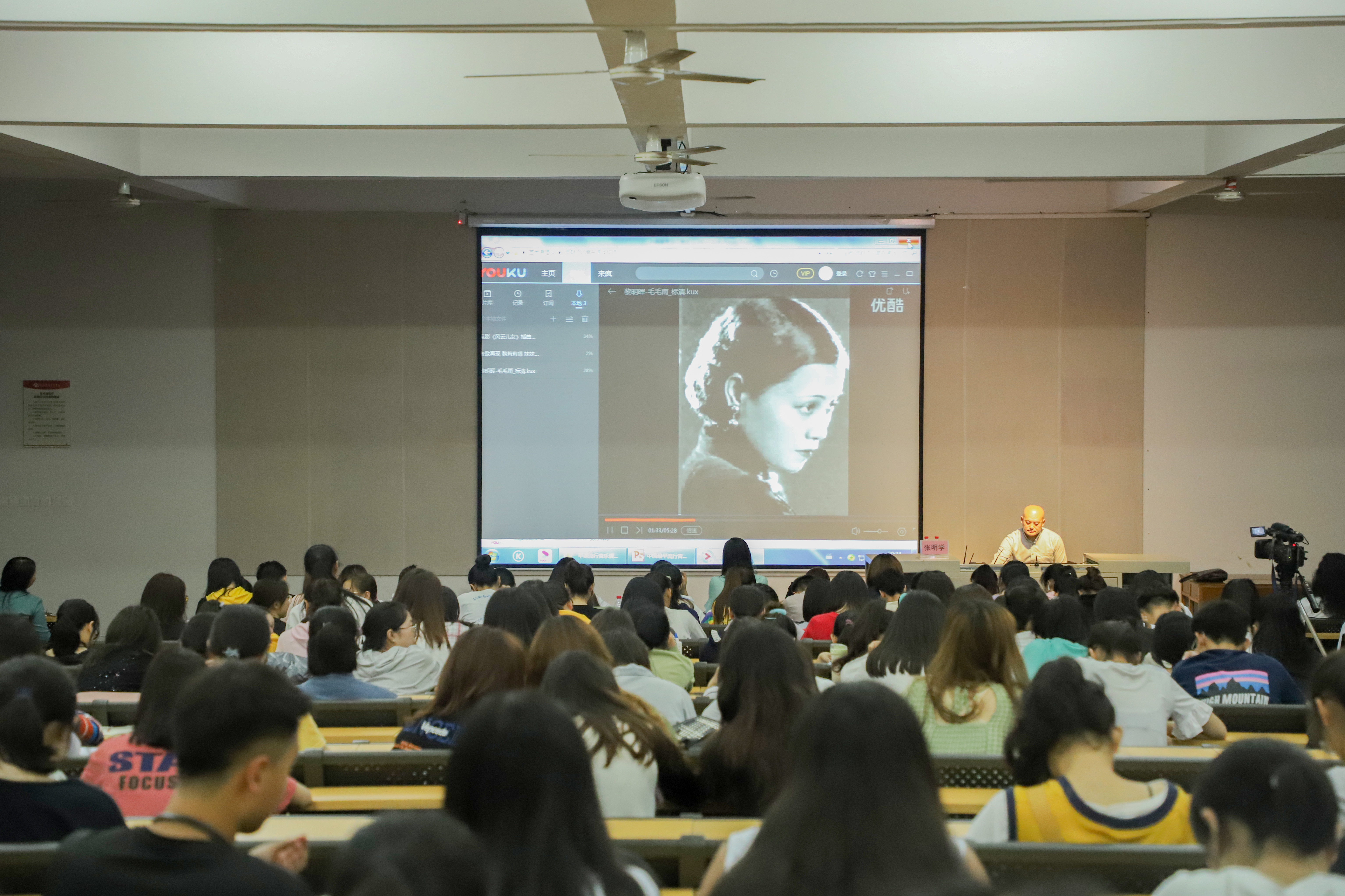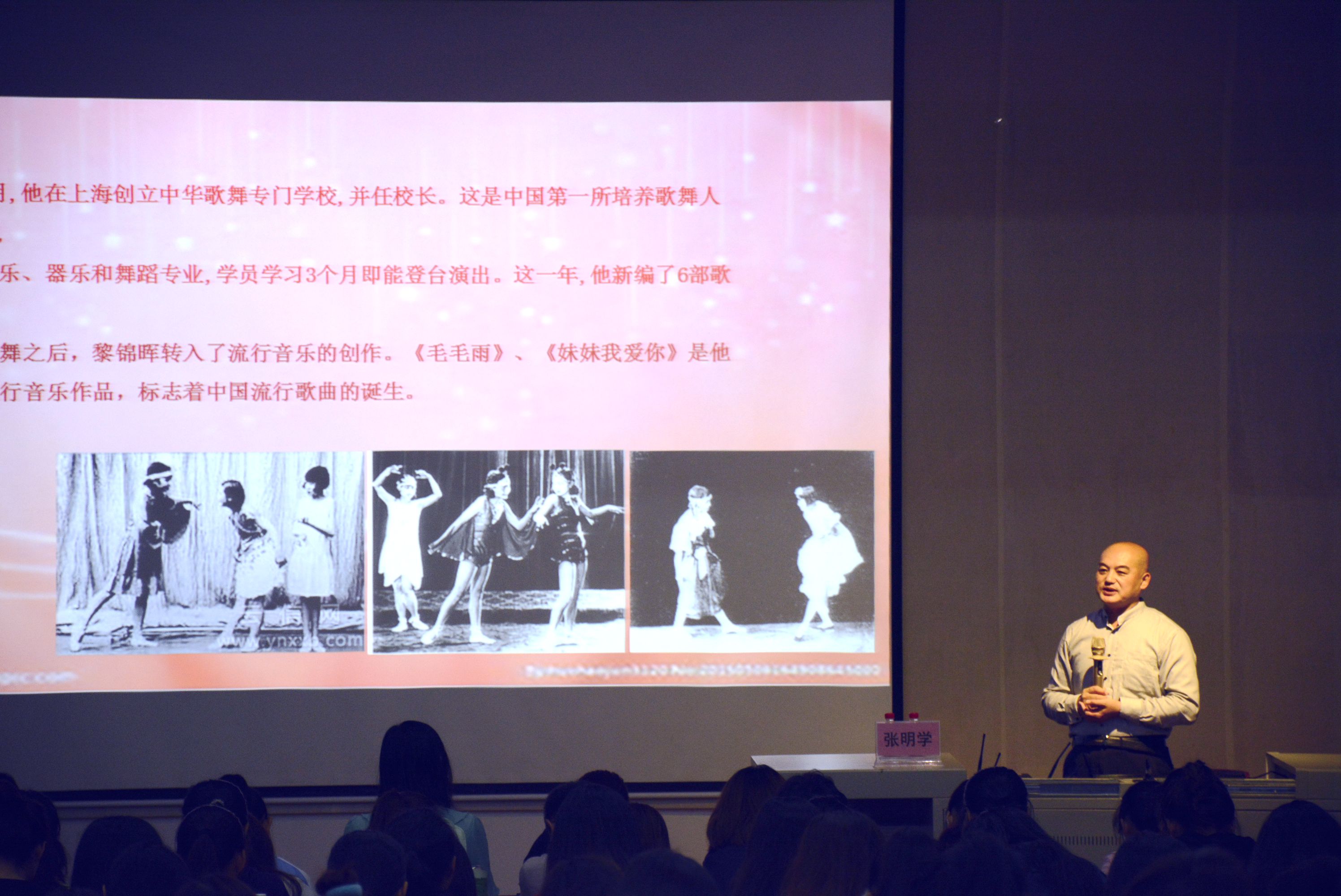 随后,张教授介绍了中国流行音乐发展过程中的一批重要人物。中国流行音乐的奠基人黎锦晖,建立了中国第一所歌舞专门院校“中华歌舞学校”,创建了当时中国现代流行乐的中坚力量——“明月歌舞团”,创作《毛毛雨》等流行歌曲。到了抗日战争时期,聂耳创作的《义勇军进行曲》则为抗日宣传做出了巨大的贡献,这类的音乐作品为中国无产阶级革命音乐的发展指明了方向,树立了中国音乐创作的榜样。上世纪三、四十年代,周璇、白光、李香兰、姚莉、白虹、吴莺音、龚秋霞等七位歌星出现成为中国早期流行音乐故事的缩影。