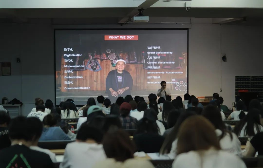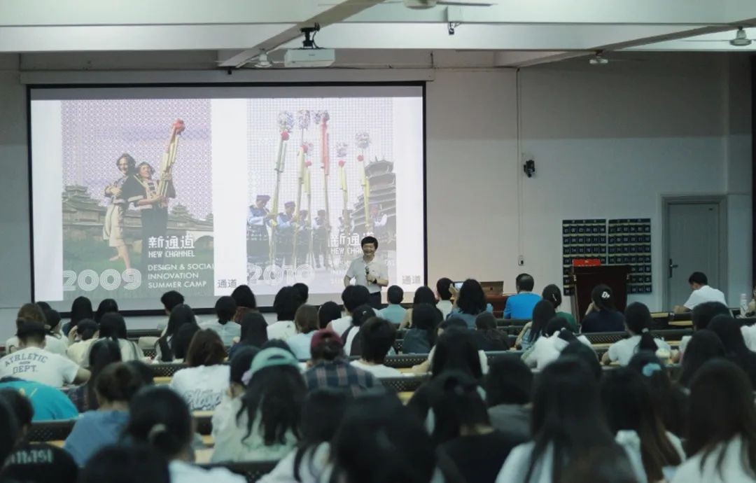 讲座过程中,何人可教授介绍了他基于侗族文化设计创新的项目《新通道设计与社会创新项目》。他指出,所谓通道指的是湖南省怀化市通道侗族自治县,新通道则包含让传统文化走向现代设计,让中国文化走向世界,通过精准扶贫让当地特色文创走向世界三方面内容,设计与社会创新便是利用专业知识来解决社会问题。何教授表示因为交通闭塞,外界影响小,具备亲密的社区关系,通道县地域文化得以完整保存。对此,他表示保持传统文化最重要的一点是要保证社区的可持续性。