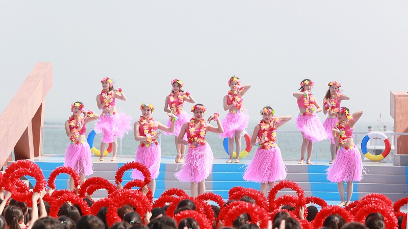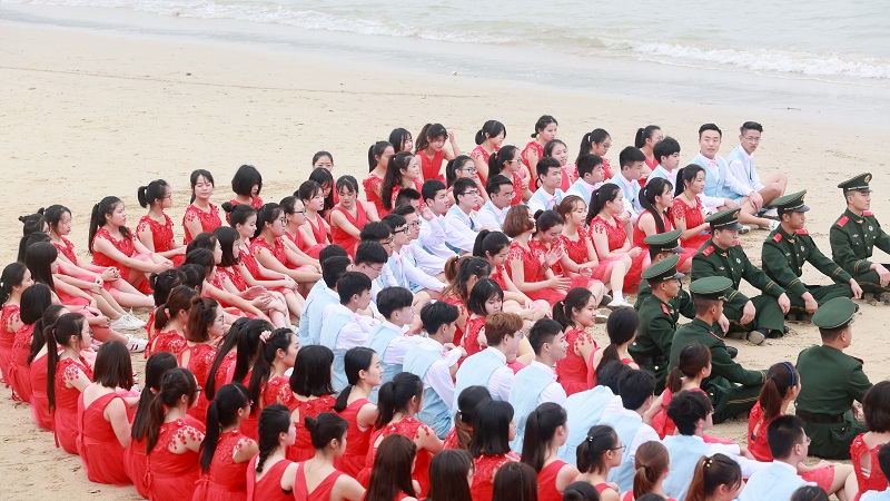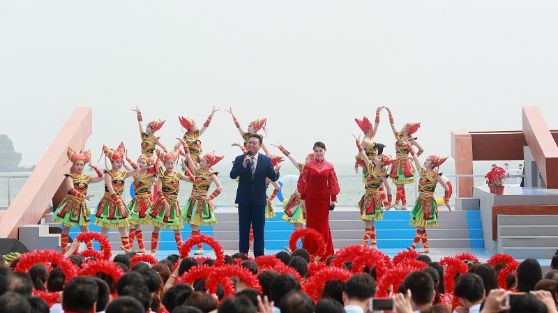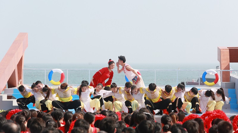 整台文艺活动的开场设在美丽洁白的沙滩上,涠洲岛南湾海滩沙滩干净整洁,蓝盈盈的海水清澈见底,配上演员们动人的舞姿,堪称一幅天然的绝美画卷。