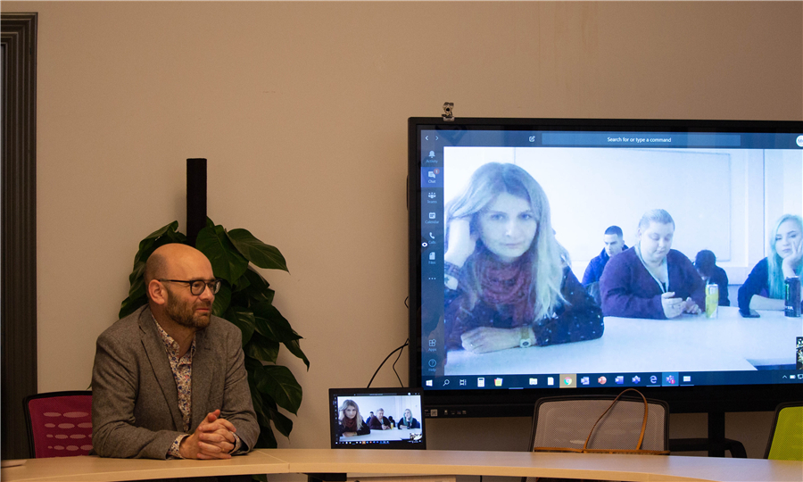 2019年11月29日晚上19:00,Matt Hawthorn 副院长和我校师生在视觉设计国际工作室,通过网络与远在英国德比大学产品设计专业的师生进行了视频交流。我校师生与英国德比大学的 Adela Glyn Davies老师和她的学生相互做介绍与问候后,同学们针对各自的专业、未来理想及项目设计形式、流程、周期等多方面进行了对话。