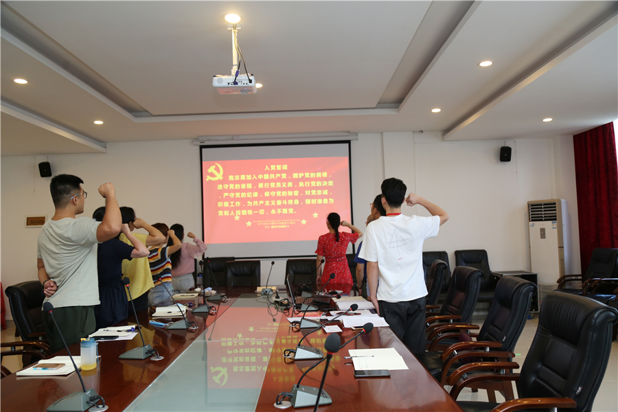 活动在国歌声中拉开帷幕,在庄严的党徽面前,支部书记何敏芝带领全体新老党员一起宣读入党誓词。“我志愿加入中国共产党,拥护党的纲领,遵守党的章程,履行党员义务......”,在党徽的见证下,党员们高举右拳齐声宣誓,庄严的入党誓词振聋发聩、响彻现场,这是每一名共产党员在入党时许下的第一个承诺,也是每一代中国共产党人持之以恒的追求。