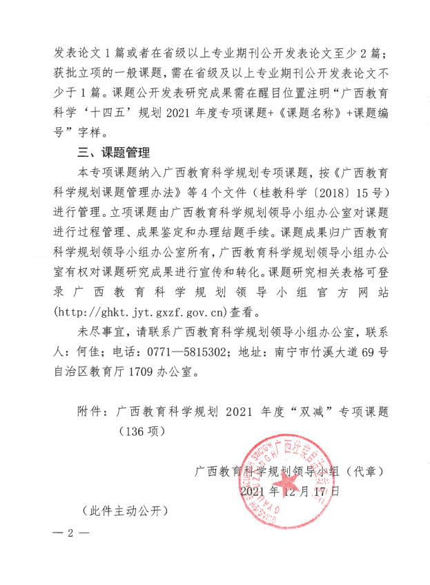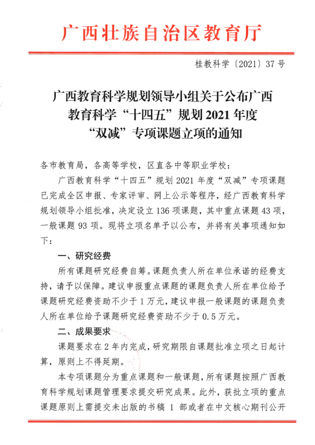 广西教育科学规划领导小组关于公布广西教育科学”十四五“规划2021年度“双减”专项课题立项的通知