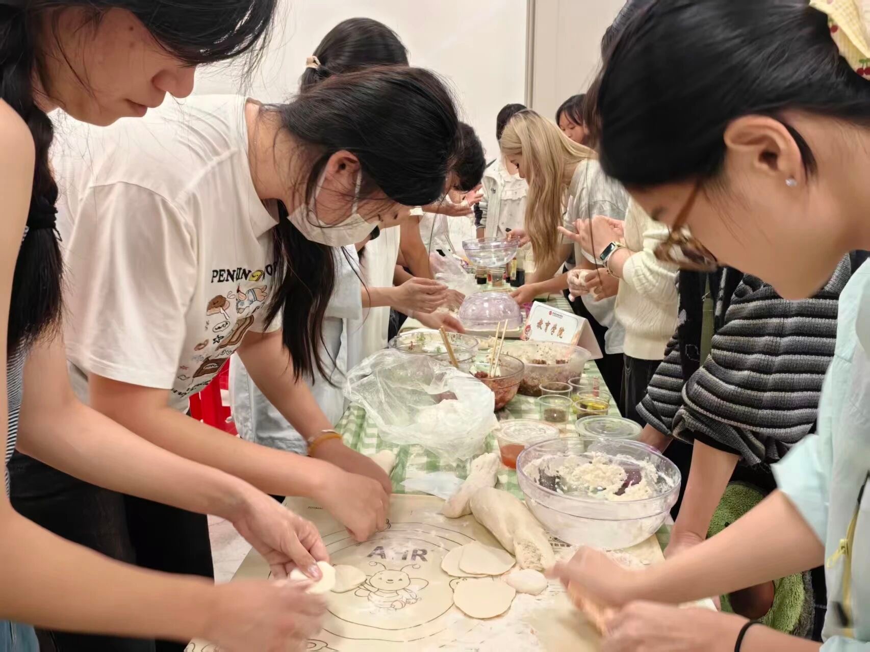 随后开展的包饺子环节将活动氛围推向高潮。全体参与人员以小组为单位协作配合,揉面、擀皮、包馅等各环节有序推进。手法娴熟的师生主动分享包饺子技巧,耐心指导初次尝试的同学,大家在交流互动中增进了解,在捏褶塑形的过程中不时传出欢声笑语。在一揉一擀、一包一捏的实践操作中,师生们深刻感悟冬至传统习俗所蕴含的温暖情谊与深厚民族文化内涵。