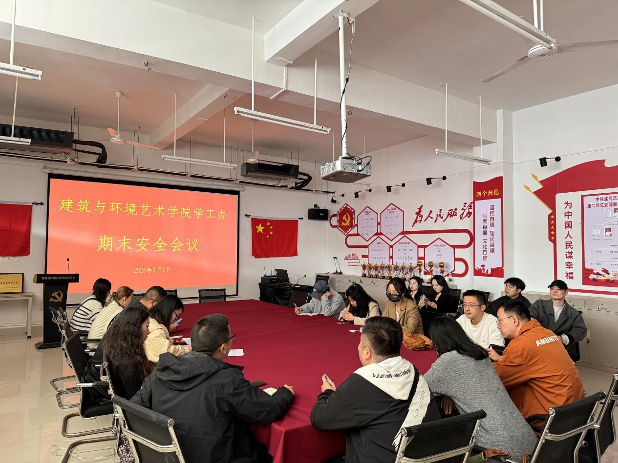 2025年1月3日,建筑与环境艺术学院学工办期末安全会议在公德楼507召开。本次会议由建筑与环境艺术学院党总支副书记曲玥与学工办主任郭溪共同主持,参与会议的人员包括学工办全体成员以及22至24级的年级和班级辅导员。会上着重强调以下要点: