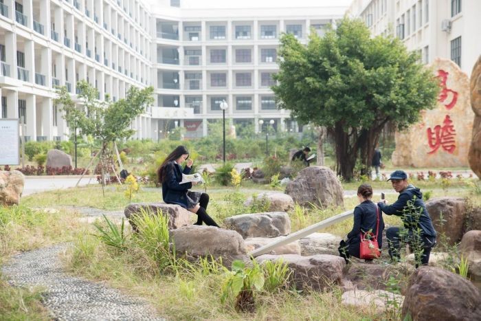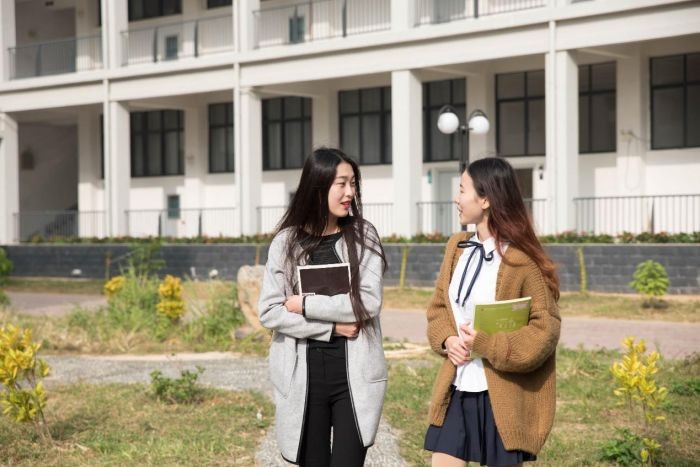 这是公德楼楼下的拍摄场地,阳光不燥,微风正好。两位正在交流问题的同学款款走来