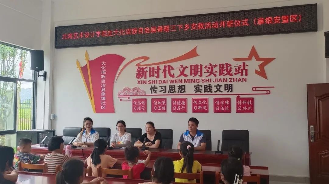 12日上午,支教关爱服务团到达了大化瑶族自治县安置区拿银社区公共服务中心。受到当地领导和人民的热情接待,拿银驻村第一书记韦婵,党支部书记、主任肖妍,妇联主席、儿童主任韦卫梅和支教关爱服务团及小朋友们共同举办了《北海艺术设计学院赴大化瑶族自治县暑期“三下乡”支教活动开班仪式(拿银安置区)》。