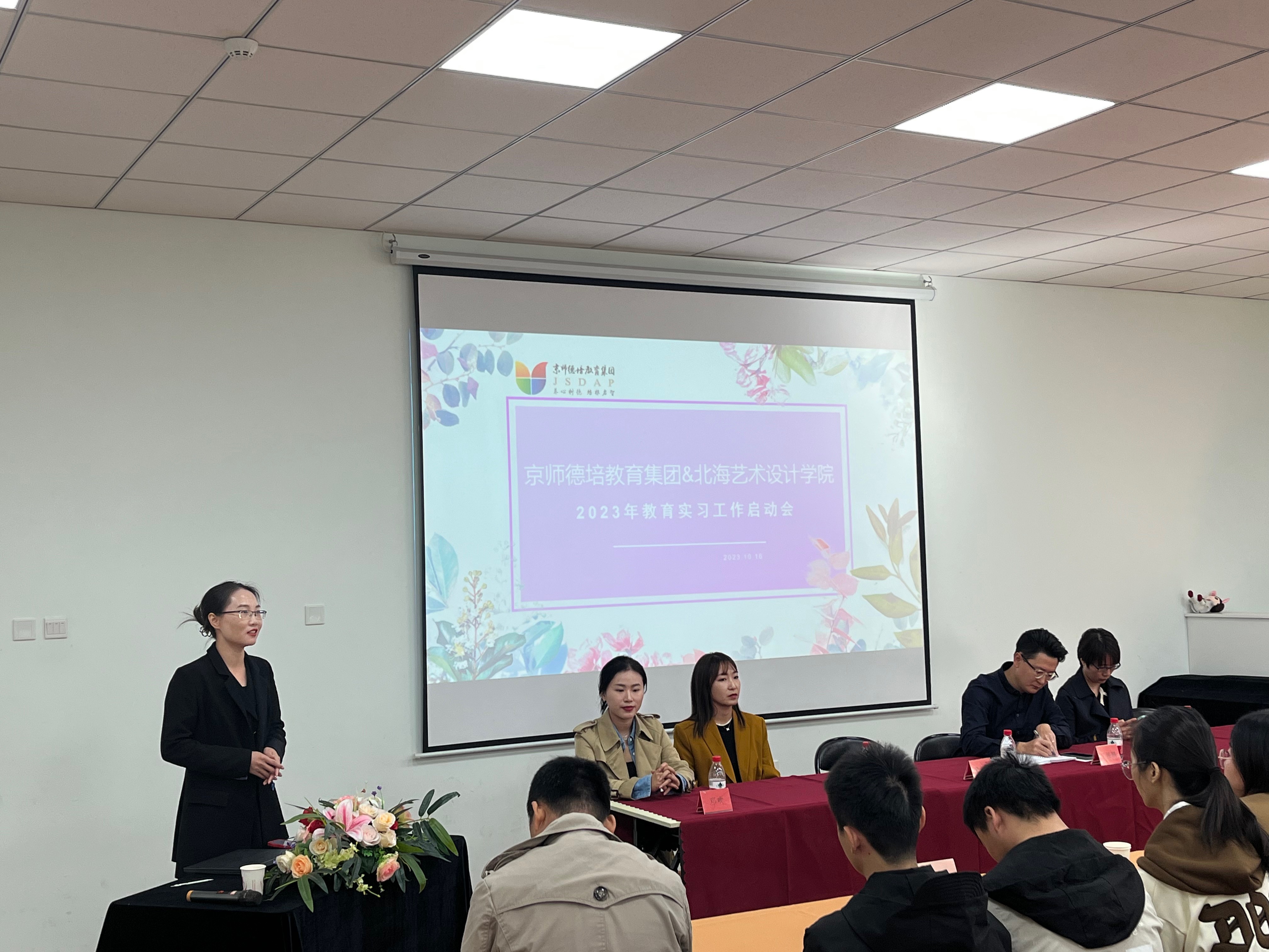 会议伊始,京师德培教育集团幼儿园园长代表张欣首先对实习生的到来表示欢迎,并强调作为幼教人务必时刻践行“德行、能力、态度、站位”八字箴言。即不管是站在学生还是教师的角度都务必遵守师德这一神圣不可侵犯的红线;重视理论实践后的转化及反思能力的培养;以阳光、谦逊、积极、团结的态度开展工作;明确站位,心有多大,舞台就有多大。在实践过程中打开格局、放宽视野,珍惜机会,培根启智,从京师启航做幸福的幼教人!