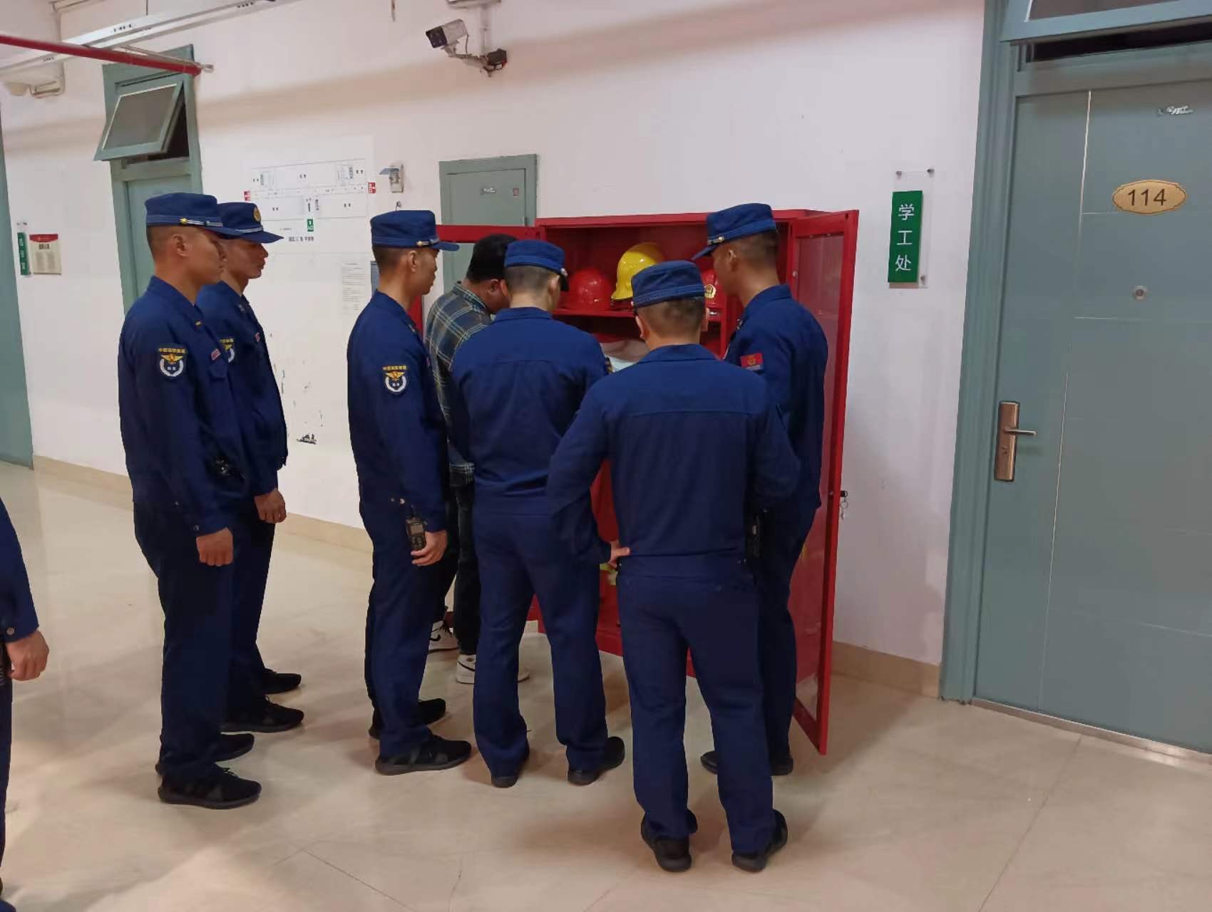 演练中,学校保卫处副处长冯海波向消防员介绍了学校有关建筑结构、功能分区、消防安全基础设施配备等情况,消防员重点对场所的疏散通道、安全出口、消防设施、消防控制室、水源分布、消防通道等进行了实地查看。随后,针对重点部位设定火情进行模拟演练,整个演练做到了熟练、快速、准确。