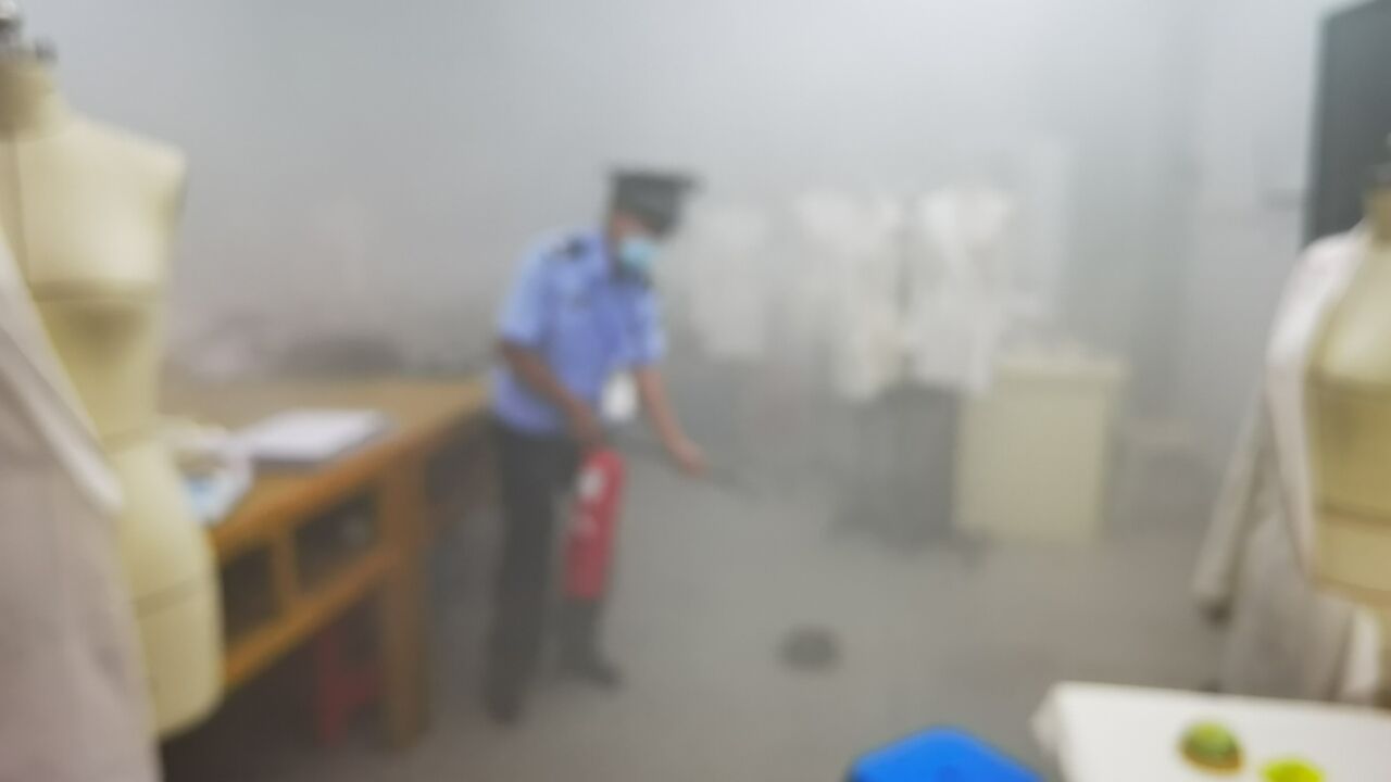 上午9点30分,学生紧急逃生演练正式开始。实训室烟雾弥漫,任课教师指导学生紧急疏散并报警,学生们捂住口鼻,快速疏散至学校操场。保安人员第一时间到达现场,寻找到火源迅速灭火。演习取得了预期的效果。