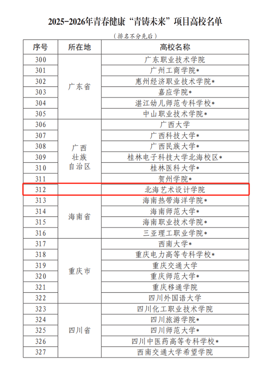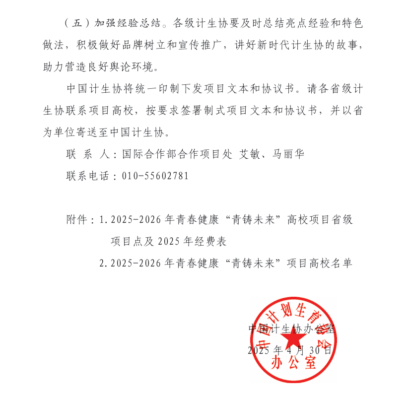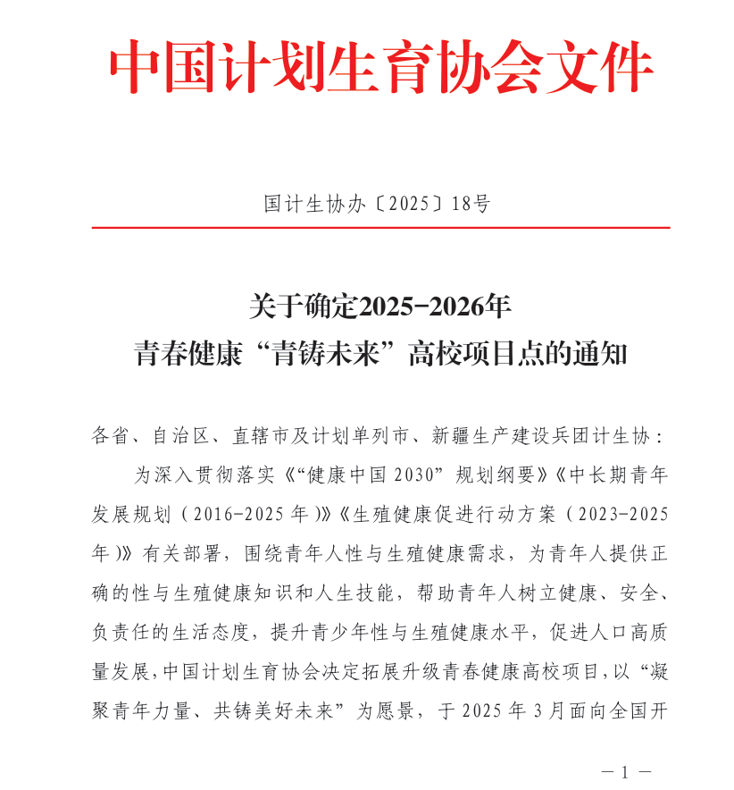 近日,中国计划生育协会印发《关于确定2025年—2026年青春健康“青铸未来”高校项目点的通知》,公布了2025年—2026年青春健康高校项目的评审结果,我校“共筑青春健康,‘艺’起走向未来”项目在全国600余份立项申请书中脱颖而出,获批立项并获得连续两年度的经费资助。
