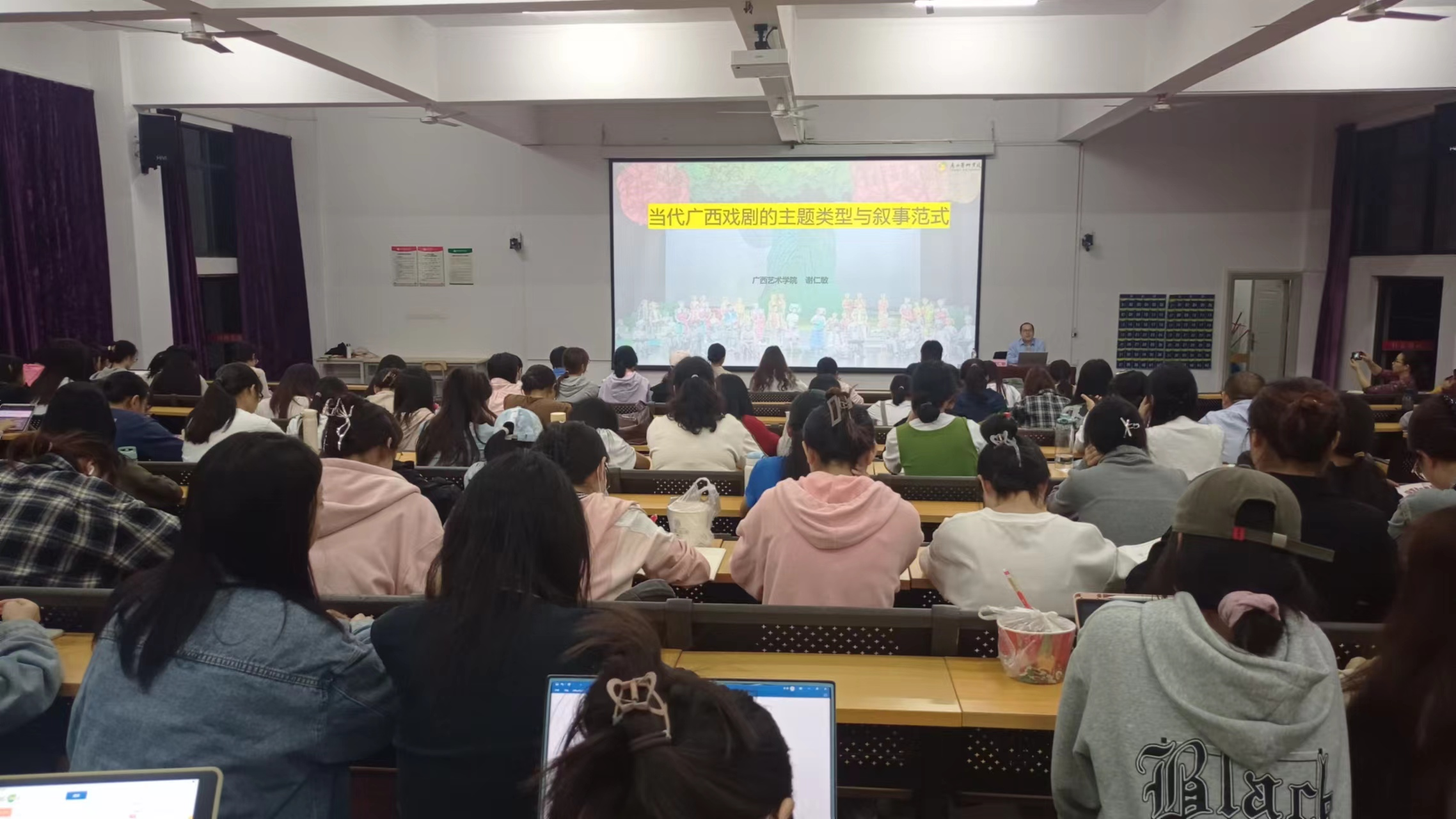 讲座最后在热烈的掌声中落下帷幕。谢教授的精彩讲解不仅让师生们对广西戏剧有了更深入的了解,也激发了大家对传统文化的热爱与尊重。此次讲座无疑为广大师生提供了一次宝贵的戏剧盛宴和文化享受。(谢佩玲/摄)