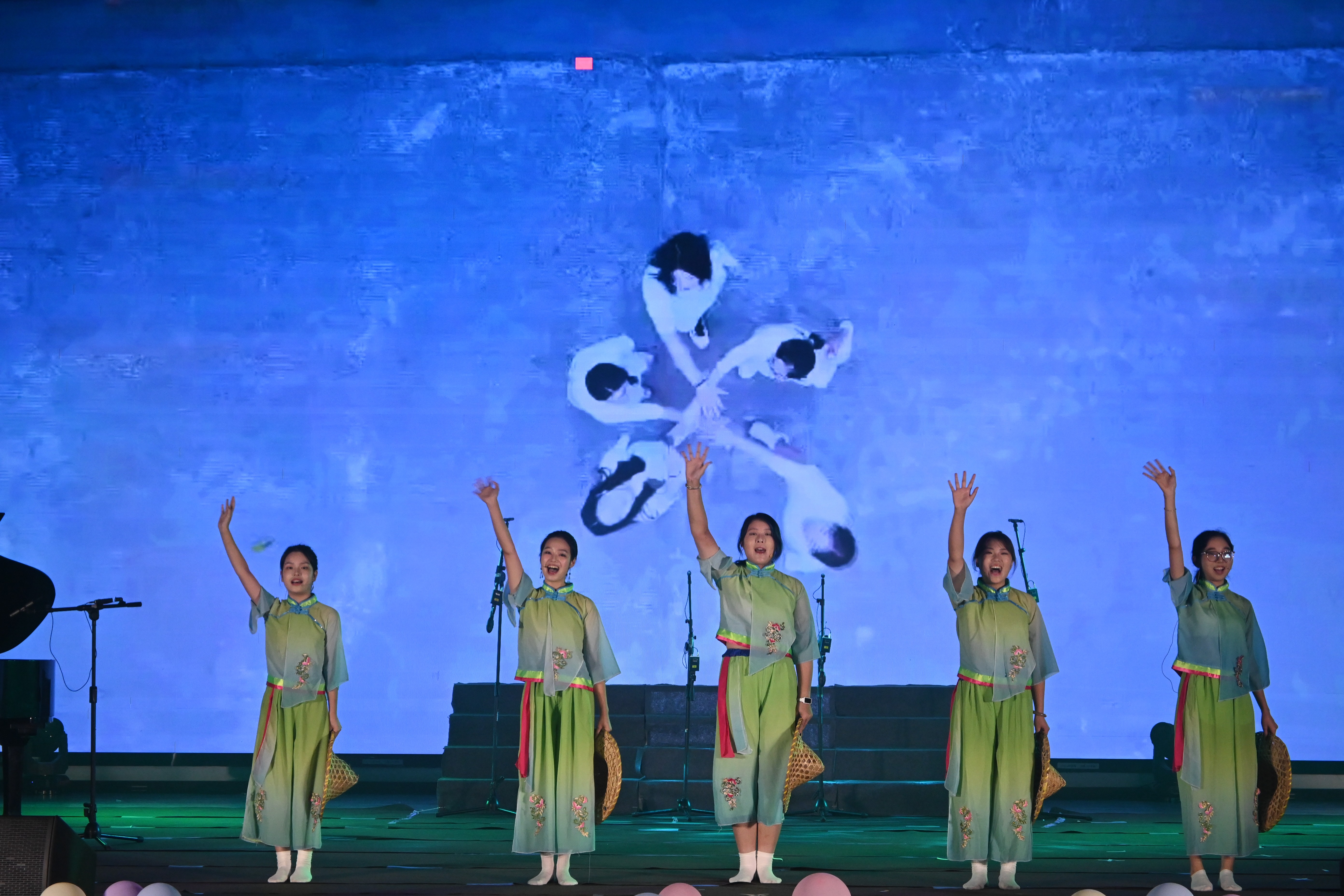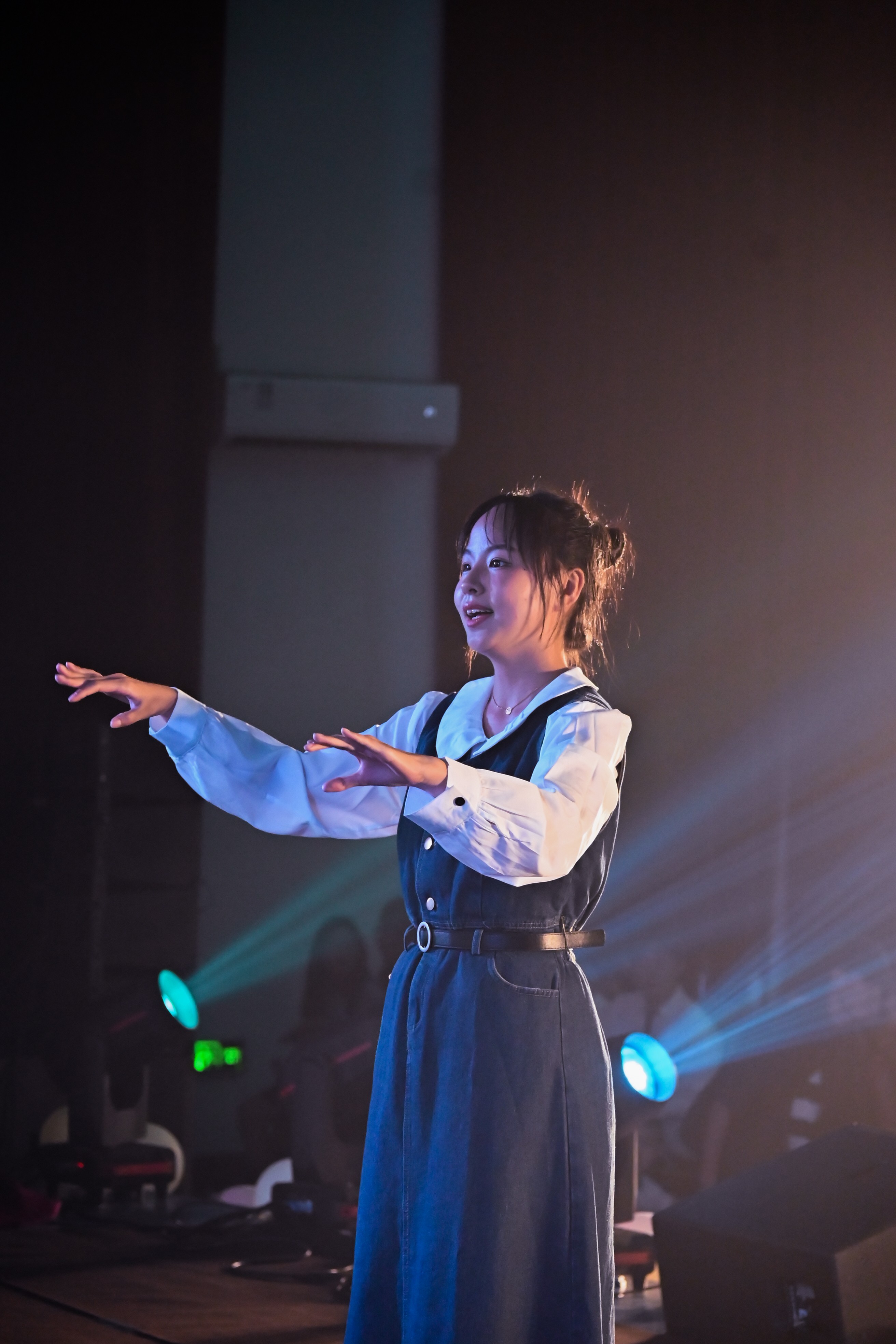 第一篇章:原创作品。一曲青春洋溢的《疍家美食颂》拉开了音乐会的序幕,王乐乐、梅紫怡、刘菁菁、徐悦、江琪五位同学将她们自己主持的国家级的大学生创新创业项目《疍歌笙生——以文创与原创音乐作品宣传疍家文化》的阶段成果搬上了舞台, AI技术与人文艺术的和谐交汇赋予了传统文化新的生命力,诠释了北海本土疍家文化的独特魅力和价值。