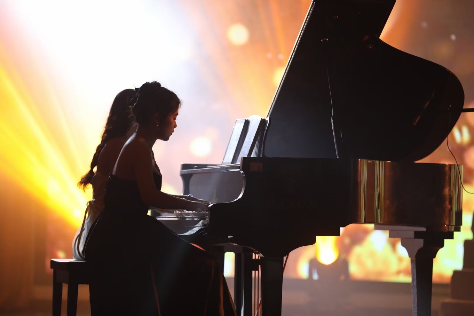 第三篇章:钢琴作品。梅紫怡、杜林繁演奏钢琴四手联弹《贝加尔湖畔》《彩云追月》,唯美的音符,从指尖流淌,这是钢琴基础、即兴伴奏等课程成果的集中展现。