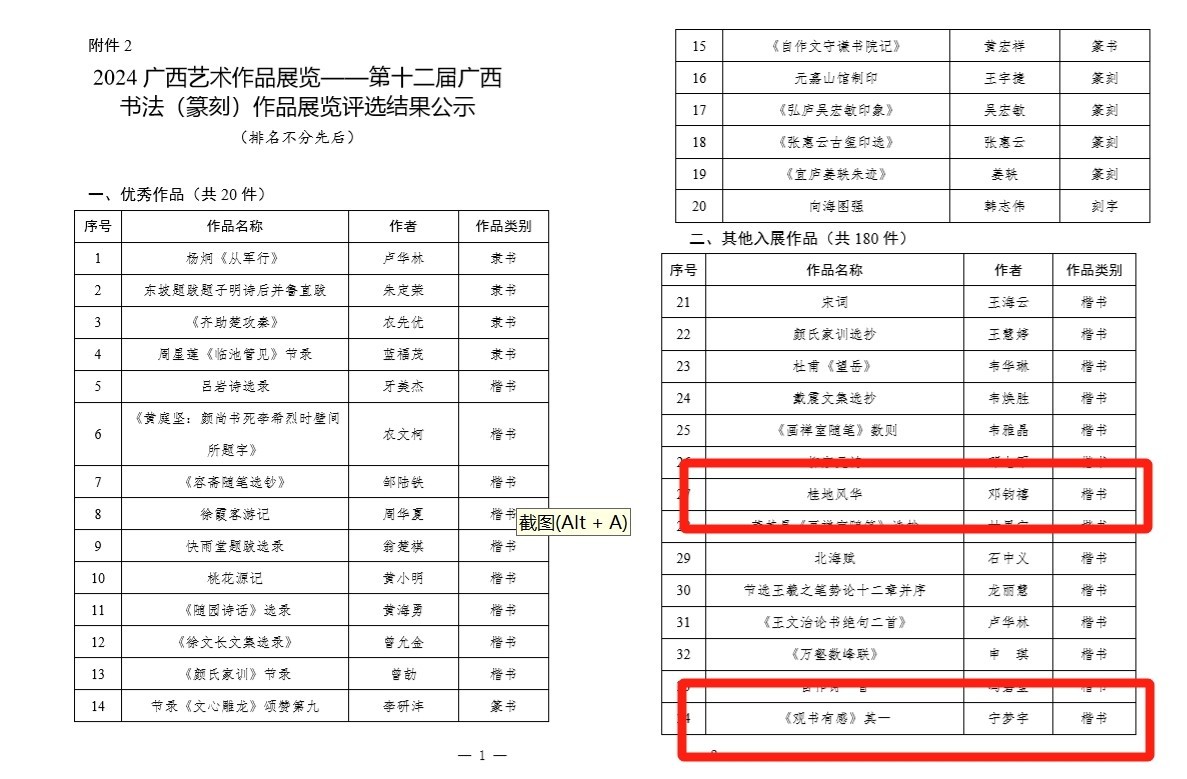 2024广西艺术作品展览——第十二届广西书法(篆刻)作品展览中,书法学院教师宁梦宇、李鑫、熊东,2022级学生邓钧禧作品入展。