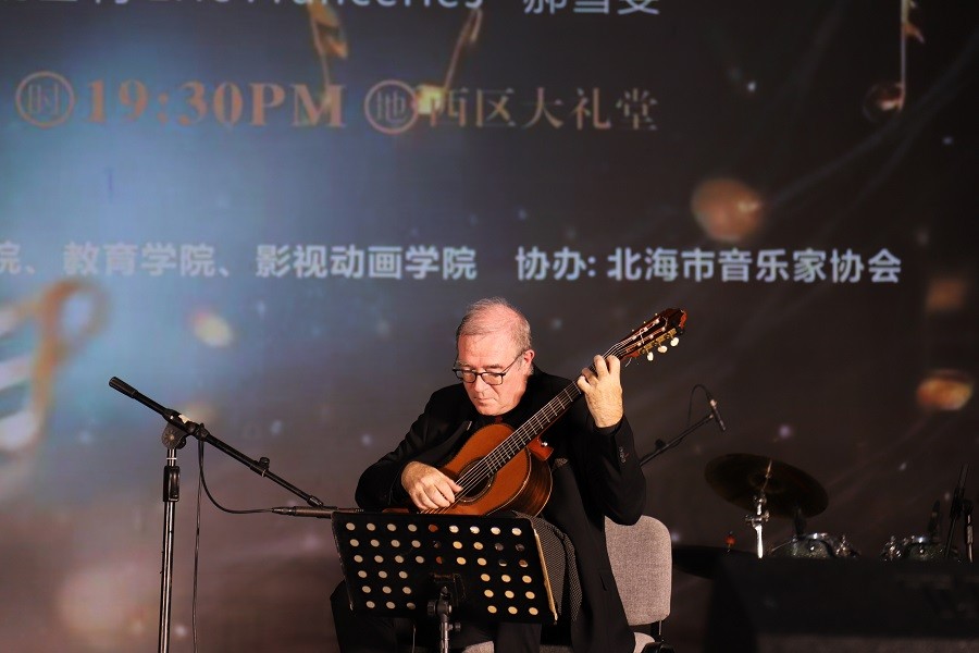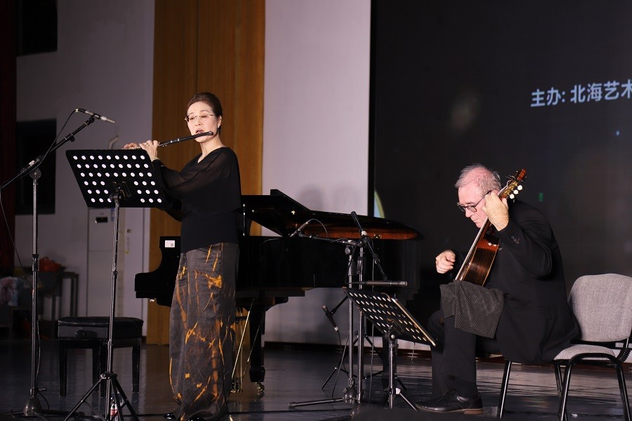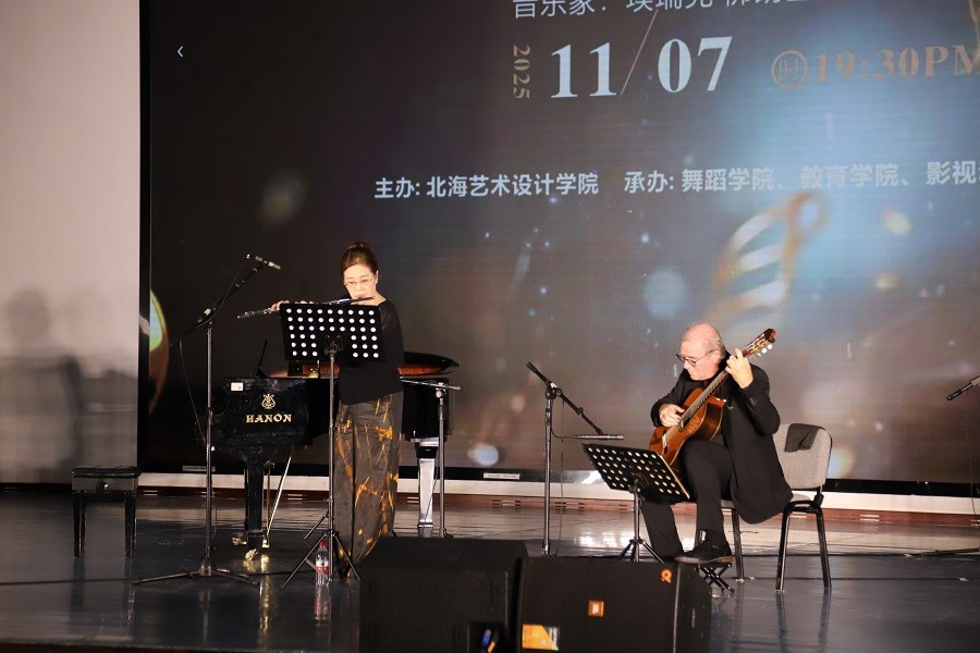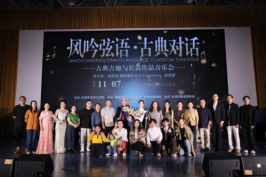 由北海艺术设计学院主办,舞蹈学院、教育学院及影视动画学院联合承办,北海市音乐家协会协办的 风吟弦语古典对话古典乐盛宴,于 2025 年 11 月 7 日在学校西区大礼堂温情上演。法国古典吉他演奏家埃瑞克·佛朗塞利与旅法长笛演奏家郝雪雯联袂登台,学校常务副校长胡胜、副校长邱杰、总督学王斌师生代表及社会各界嘉宾齐聚现场,沉浸式领略这场兼具专业厚度与艺术感染力的听觉盛宴。