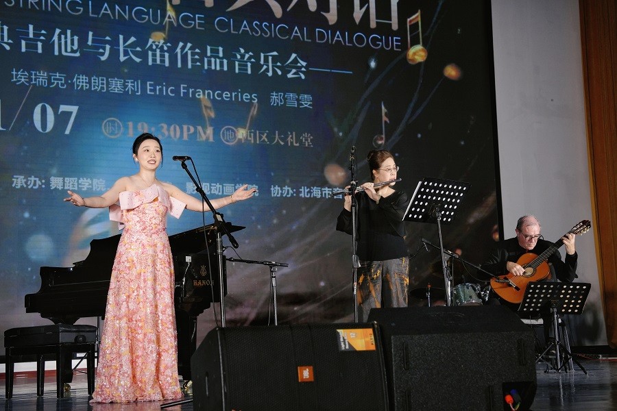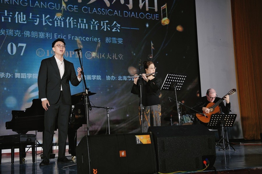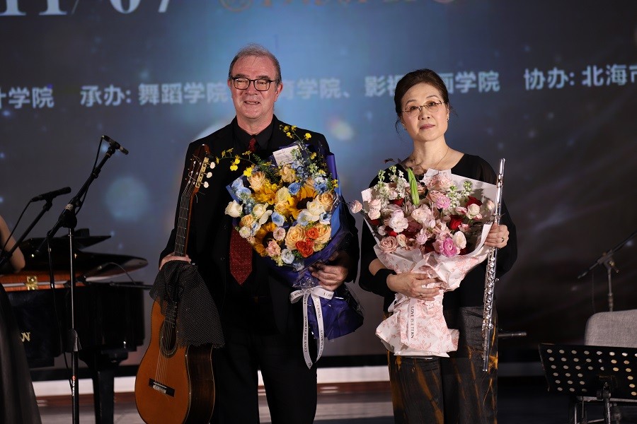 此外,埃瑞克佛朗塞利教授独奏的俄罗斯作曲家维尼斯科作品《静候佳音》,指尖流转间尽显古典吉他的独特魅力;德彪西《浪漫曲》的法式浪漫与《越人歌》的东方柔美,在郝雪雯女士与参演教师刘琛钊、卢尚蕊的携手演绎下,实现中西音乐的浪漫碰撞。压轴登场的《吉他爵士三重协奏曲》中,埃瑞克教授与参演教师马超、张靖茜及学生张凯文、莫宗霖通力合作,将西班牙音乐的热烈、墨西哥旋律的鲜活与非洲节奏的明快展现得淋漓尽致一首《世界赠我的》以长笛勾勒轮廓,吉他与乐队填充背景 的合奏美学在此刻绽放极致光彩,将现场气氛推向高潮。