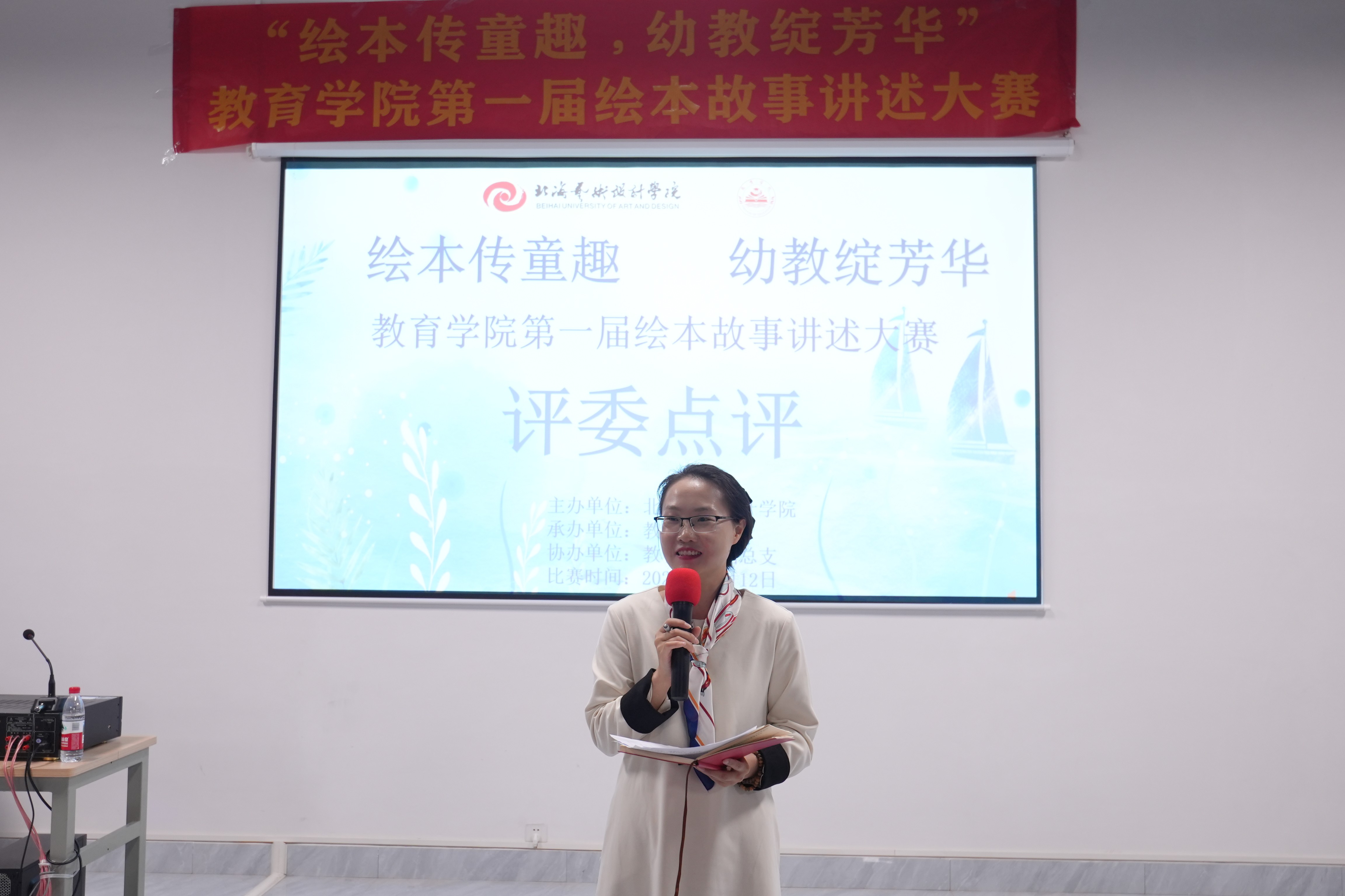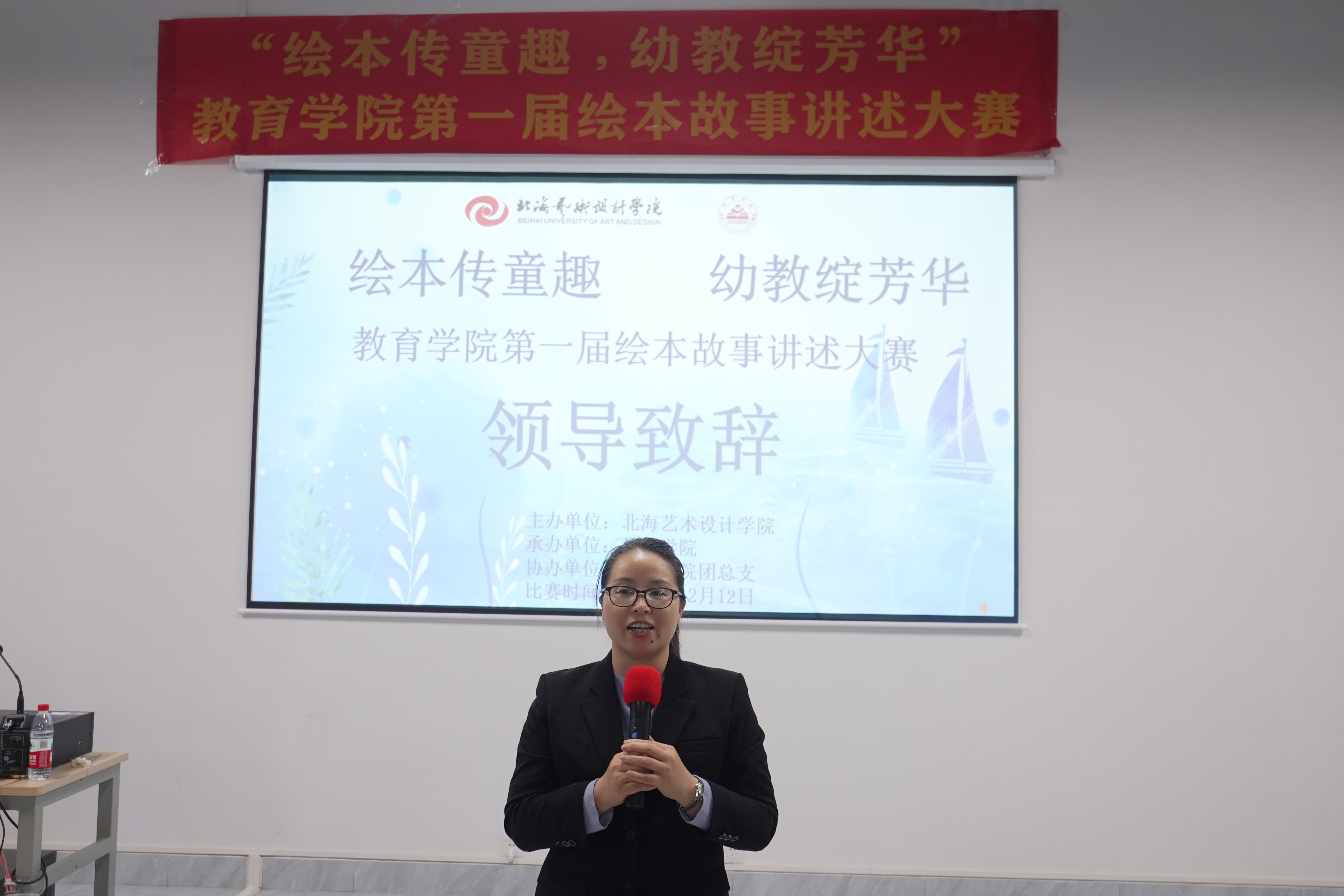 赛前,教育学院熊秀峰院长致辞。她强调,绘本故事讲述能力是幼教从业者的必备技能,希望同学们以赛促学,锤炼专业本领;同时,以绘本为载体传递海洋保护与科普理念,让海洋文化启蒙融入儿童阅读,为海滨城市的儿童文化教育添砖加瓦
