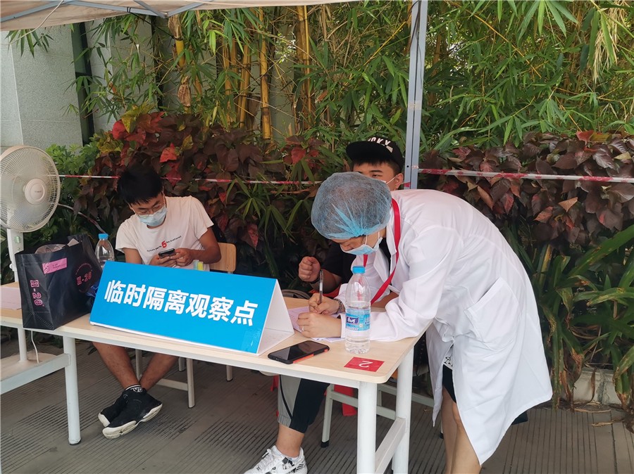 为了做好返校疫情防控工作,及时应对复学后学生身体突发状况,学校党委专门成立了“党员防控先锋突击队”。在学生返校报到的过程中,突击队员积极参与各项应急处置工作,筑起学校疫情防控的坚实堡垒。