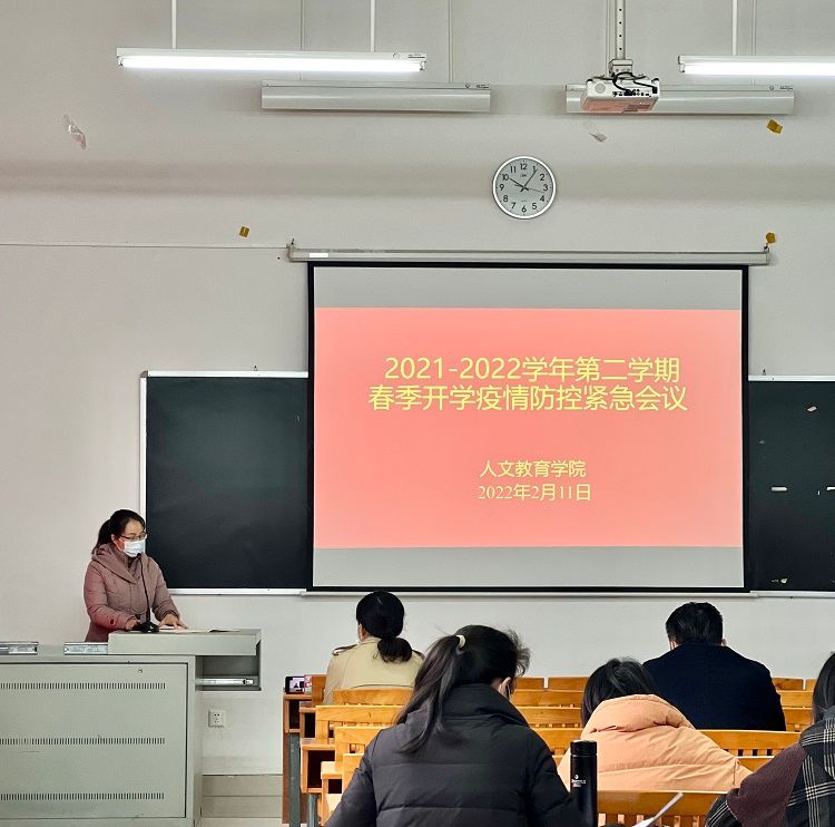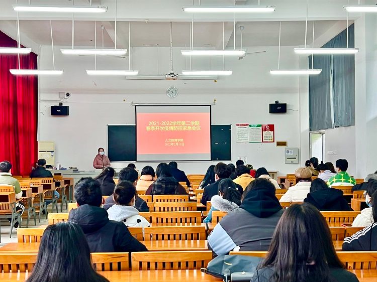 为贯彻落实自治区疫情防控指挥办公室《关于做好2022年春季学期开学返校工作的紧急通知》文件要求,稳妥推进我院2022年春季学期开学返校工作,及时安排本学期线上教学工作,确保我院春季学期疫情防控与教学工作有序开展,2月11日,我院在伦理楼101教室召开2021年春季学期开学前疫情防控工作紧急会议。我院党总支部书记刘承初、院长熊秀峰、副院长李谦、李水亮及全体教职工参加了本次会议。会议由院长熊秀峰主持。