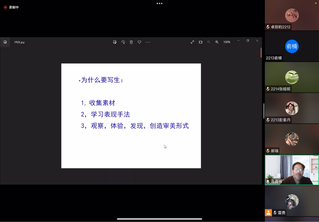 讲座伊始,马良书教授主要围绕为什么要写生这一主题展开讲述。分别从收集写生素材、学习表现手法以及观察、体验、发现、创造审美形式上进行了详细讲解。他让我们认识到了如何去写生,怎样去权衡笔墨与色彩之间的关系,以及如何去平衡画面中物体的位置及空间关系。