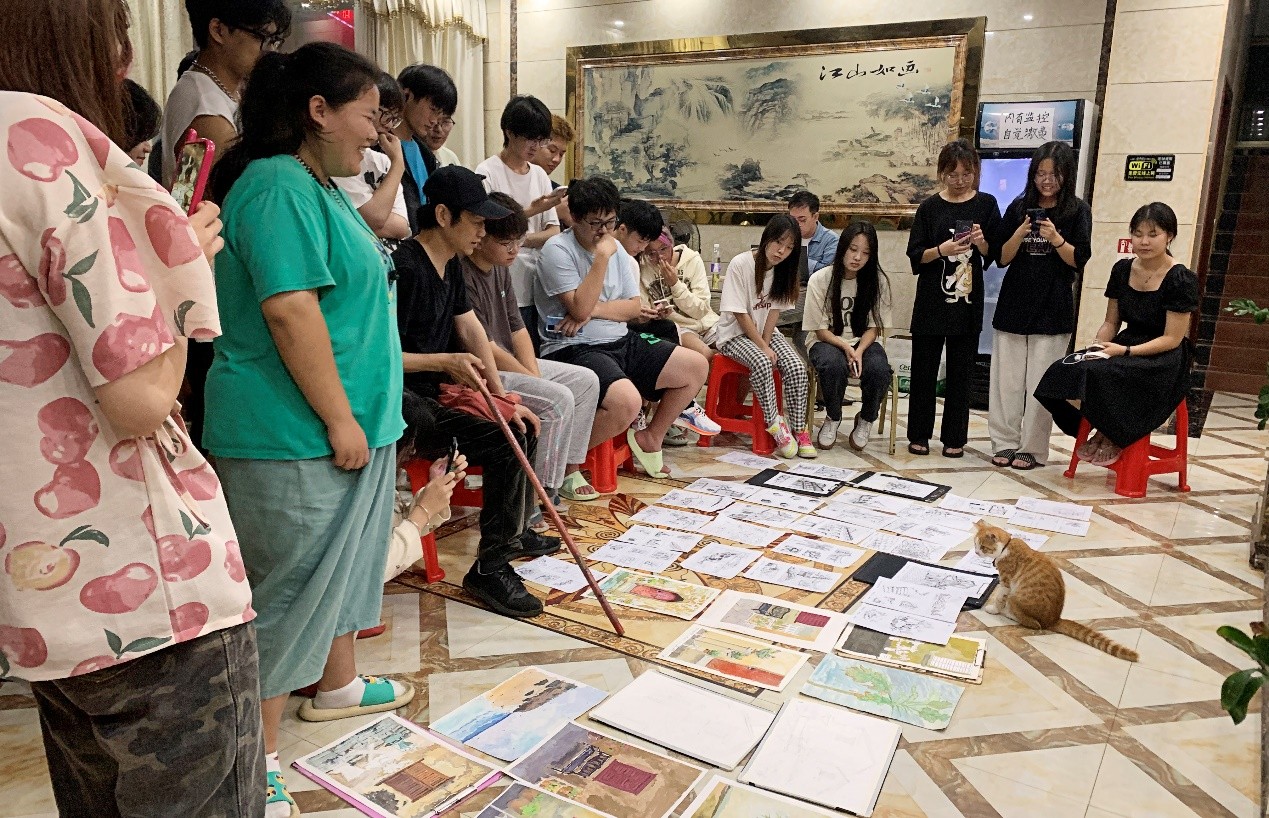 白天,在老师们的带领下,同学们有序深入景区、村庄,通过观察走访体验感悟、实地踏勘拍摄记录、艺术采风绘画写生,结合课程所学知识,感受、观察、分析涠洲岛自然风貌与人文聚落,领悟地方性色彩、空间等元素的构成魅力,并以自身理解运用美术基础与设计表现技法绘出“设计色彩”图幅。过程中,老师们悉心指导,帮助同学们了解掌握取景、构图、取舍、表现。晚上,专任教师辅助指导,教授以班级为单位开展评图教学课堂。微弱灯光抵不住同学们对专业知识学习的偌大热情,每位同学积极听取指导教授的点评意见,努力提高自身的艺术涵养与表现技法。