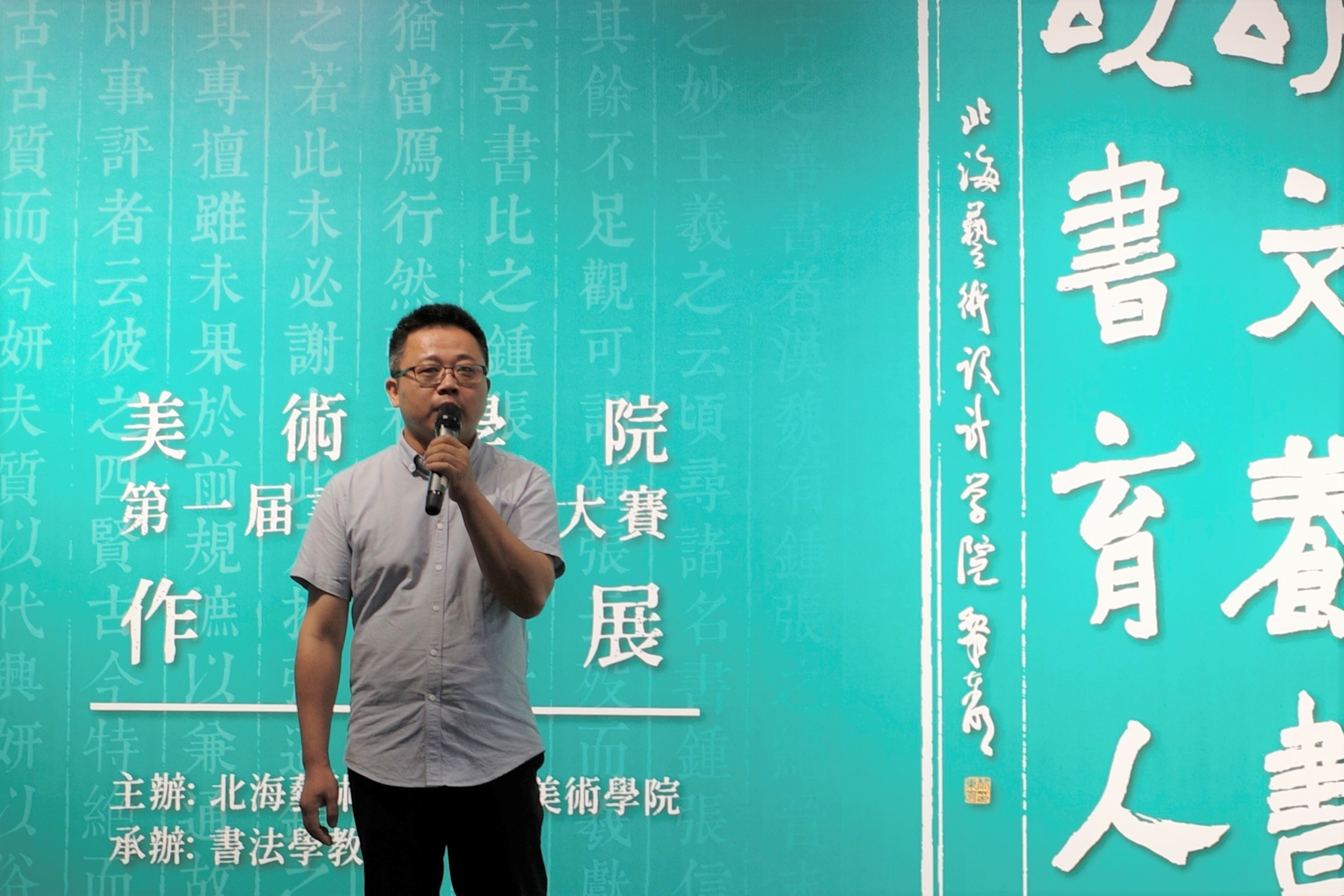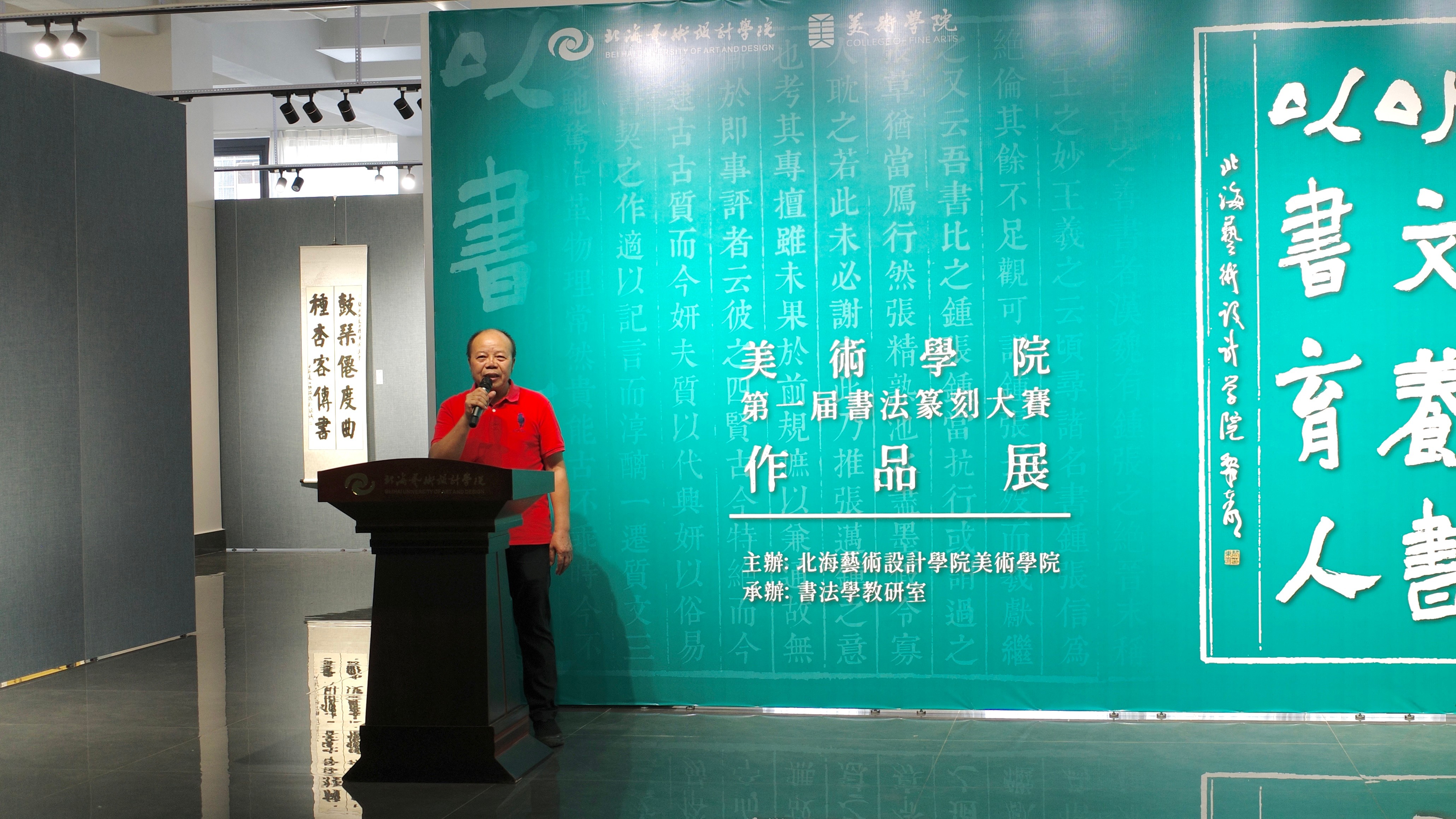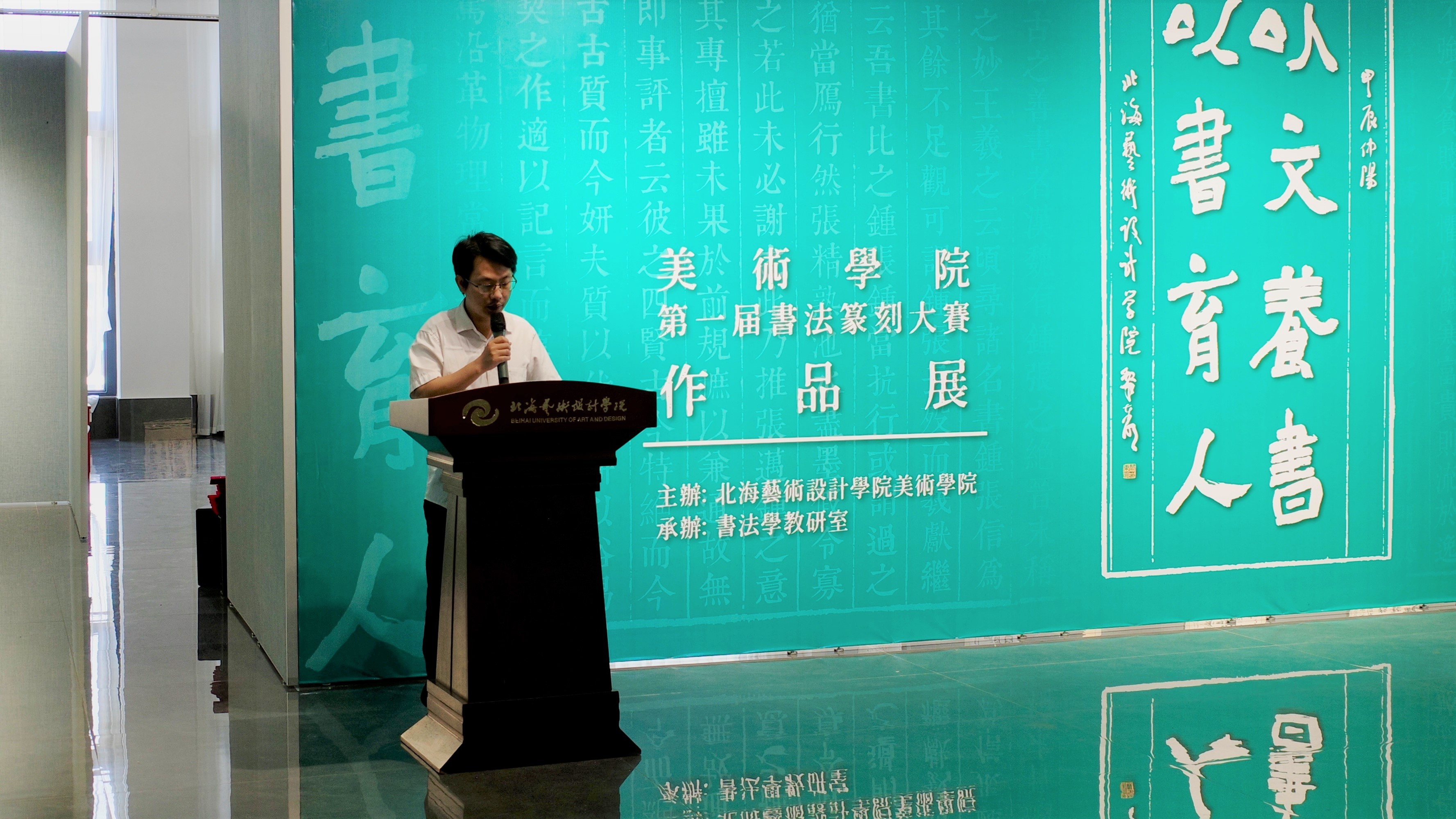 2024419日,于北海艺术设计学院艺德楼举行“以文养书,以书育人”美术学院第一届书法篆刻大赛作品展开幕仪式。本次活动由书法学教研室主任苏乃从主持,书法学专业学科带头人黎东明教授、书法学外聘教授邓建华、万应均以及20222023级书法学全体师生参与,并邀请美术学院常务副院长龚为、美术学院党总支副书记鲁明阳、美术学院学工办主任林昌华。