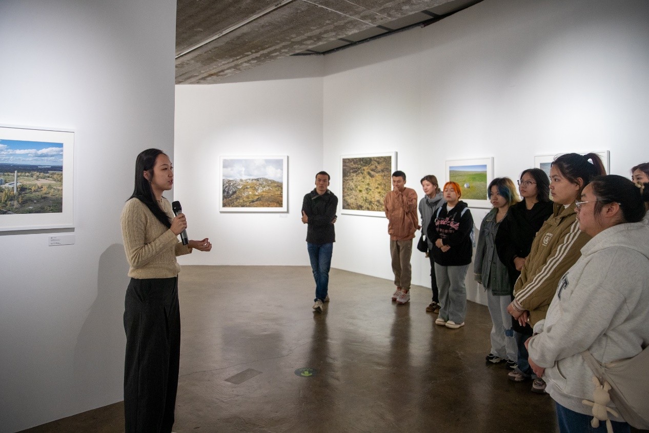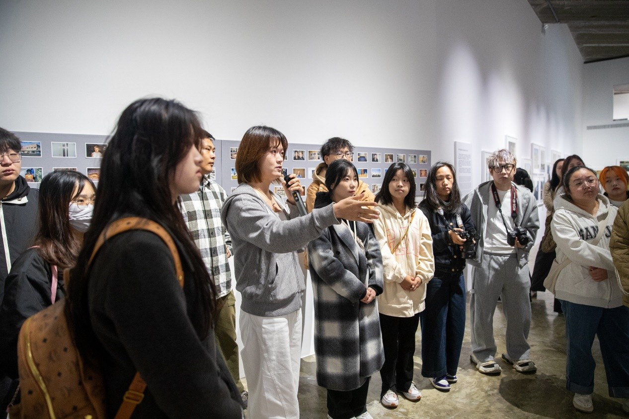 在展场内,学生们还与展览策展人进行了面对面交流,就艺术家的器材选择、创作理念等方面进行了深入交流学习。