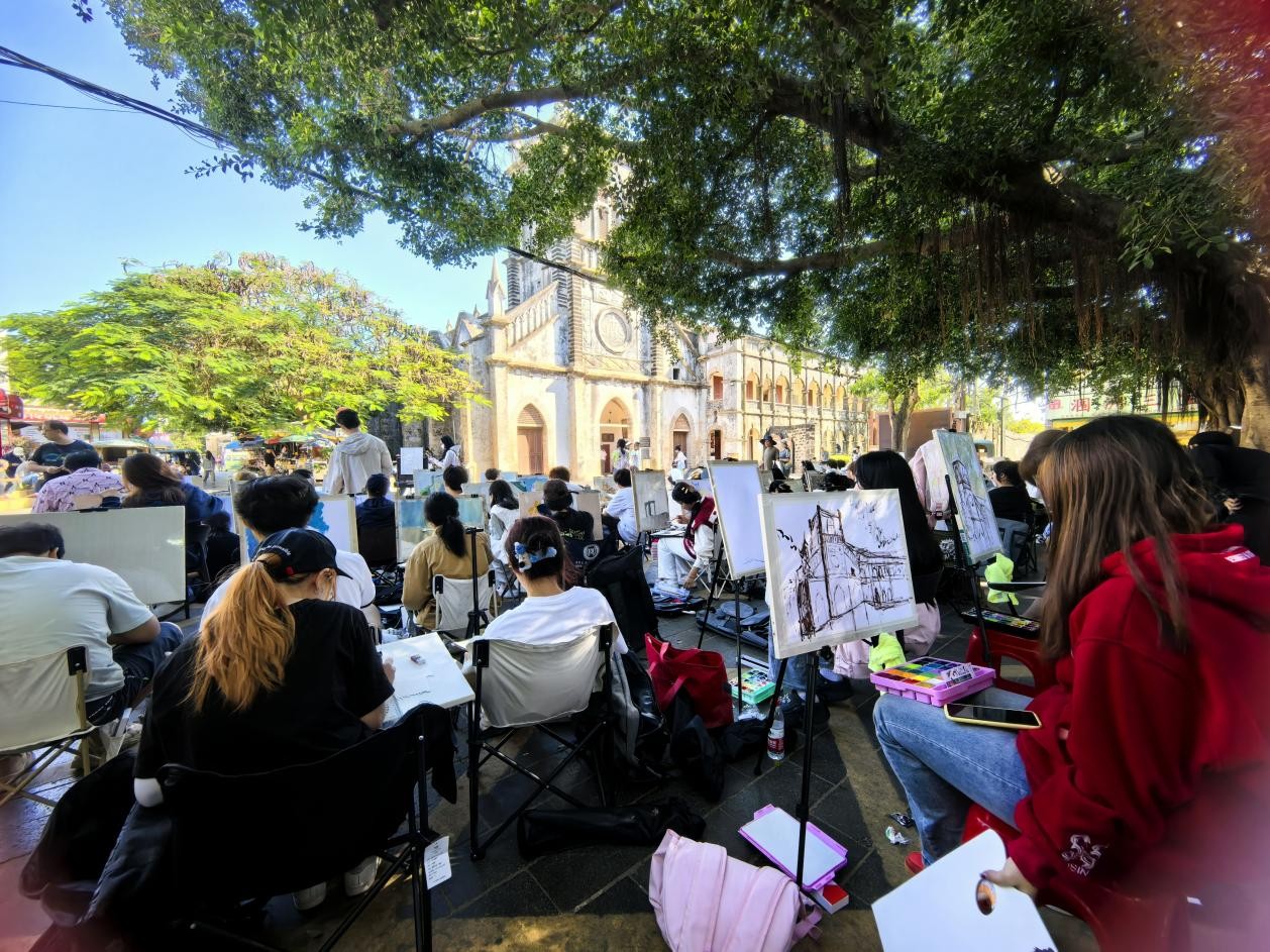 写生期间,师生们分批次前往火山口、南湾码头、天主教堂等涠洲岛的著名景点,深入体验这座海岛壮丽的地质景观和深厚的历史文化底蕴。在山海相接的自然画卷中,师生们架起画架,用画笔描绘出涠洲岛的壮美风貌。同行的刘斌教授、王少军教授、崔君旺教授和王帅教授,以精湛的专业技艺和丰富的教学经验,为此次写生活动注入了强大动力。他们在现场通过身临其境的示范教学,将理论知识与实践有机结合。从构图的逻辑到画面的完整性,从光影的微妙变化到色彩的和谐搭配,每位教授都以高度的责任感和耐心的态度,为学生进行细致的指导。教授们和任课老师们通过深入浅出的讲解和精彩的现场示范,解答学生在写生中遇到的疑惑,引导他们捕捉自然之美和人文细节的独特视角。学生们在亲身实践中,将构图设计、光影表现和色彩运用等艺术语言逐步融入自己的创作中。这样的教学方式不仅增强了学生的艺术感知力,也激发了他们的创作热情,为整次写生活动增添了深厚的艺术内涵和生动的互动氛围。