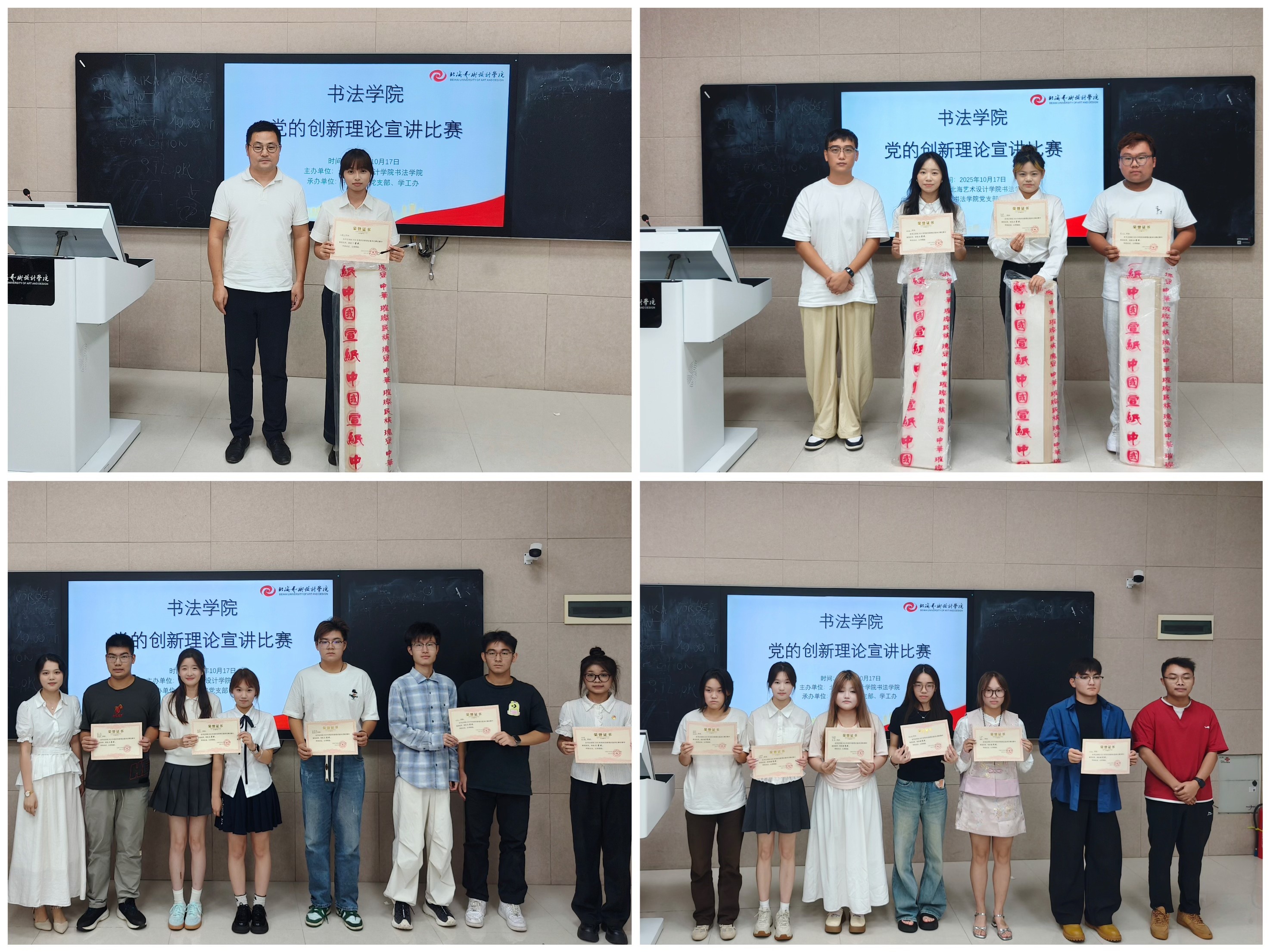 为扎实做好宣讲工作,持续推动党的创新理论入脑入心,1017日,书法学院在西校区图书馆智慧教室506开展党的创新理论宣讲比赛。学院党支部副书记左云飞、副院长李家琪、韦志忍、黄荣婷出席活动并担任评委。