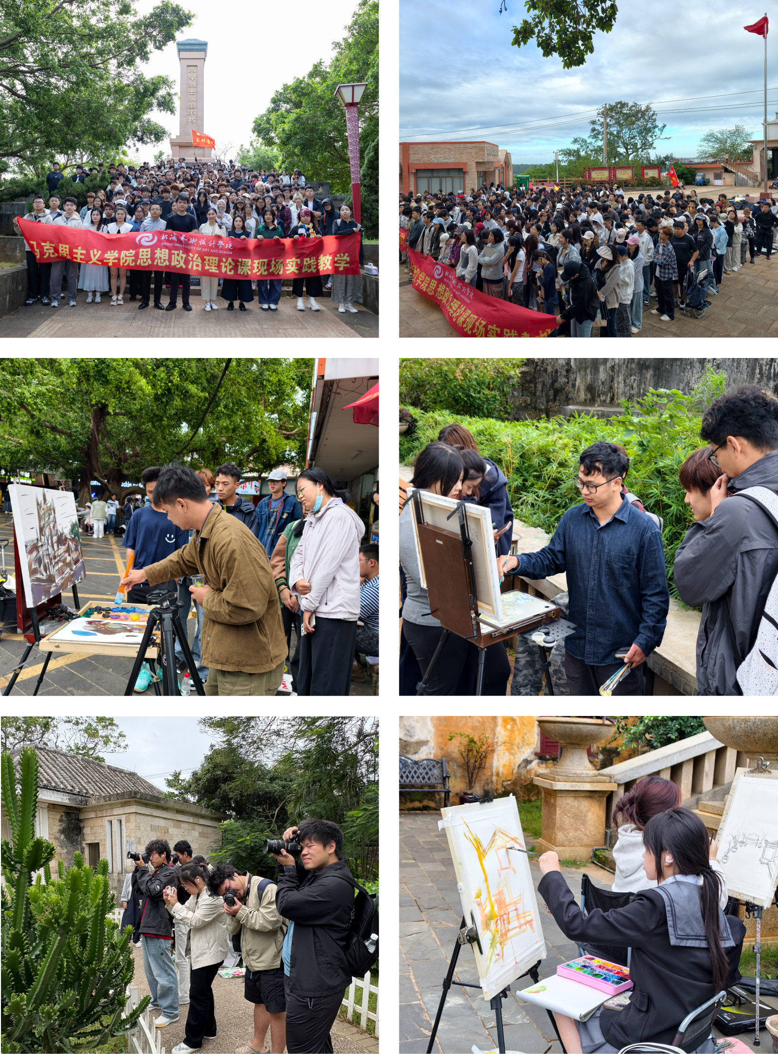 红色广场上,一场别开生面的思想政治理论课现场宣讲同步开展。教学团队以红色场馆为实景课堂,将抽象理论与现场场景深度融合,让学生在红色热土上感悟初心使命,将家国情怀融入艺术创作理念。随后,师生们探访了由珊瑚沉积岩筑成的涠洲天主教堂,这座兼具法式哥特风格与海岛特色的百年建筑,为学生提供了人文题材创作的鲜活素材。