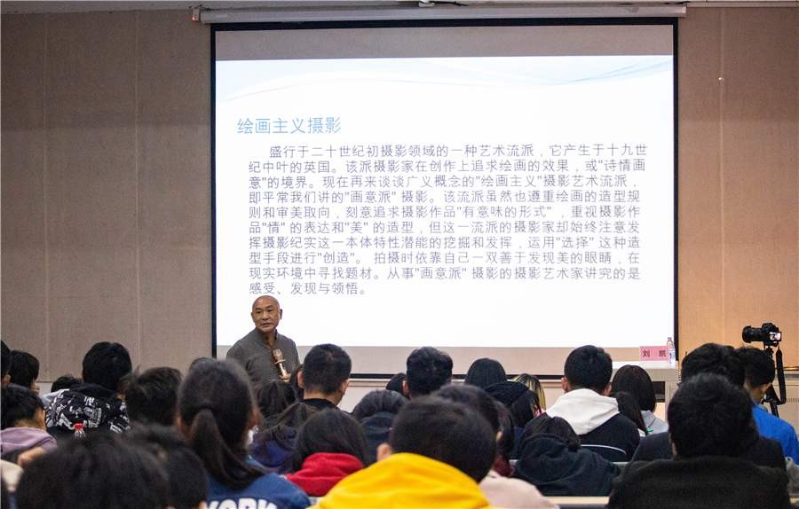 刘教授分别从“摄影的意义及其概述”、“大学生人文摄影与关注”和“摄影作品创作过程分享及趣味摄影”三方面,结合丰富的照片范例,给现场师生上了一堂生动活泼的摄影课。