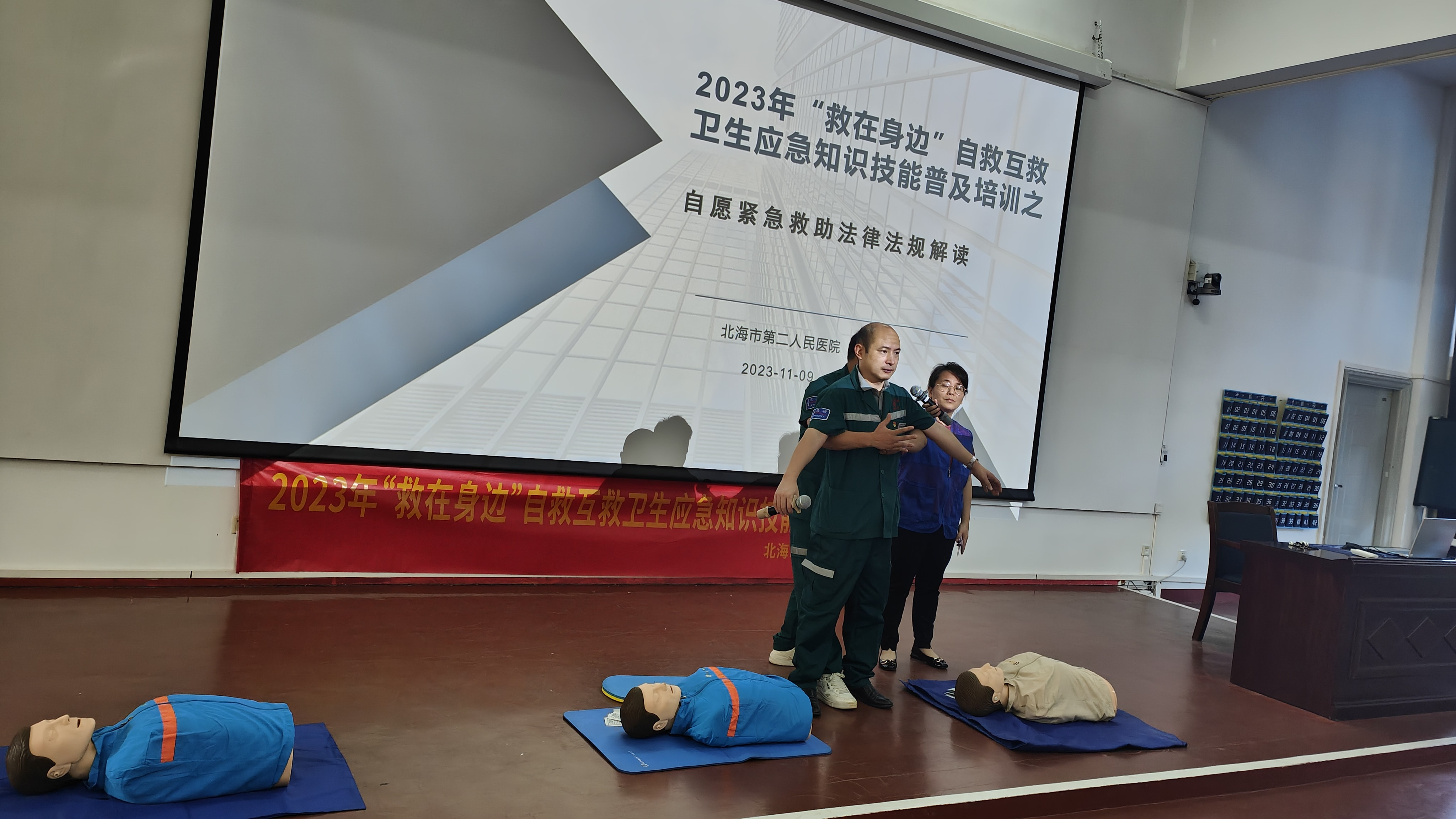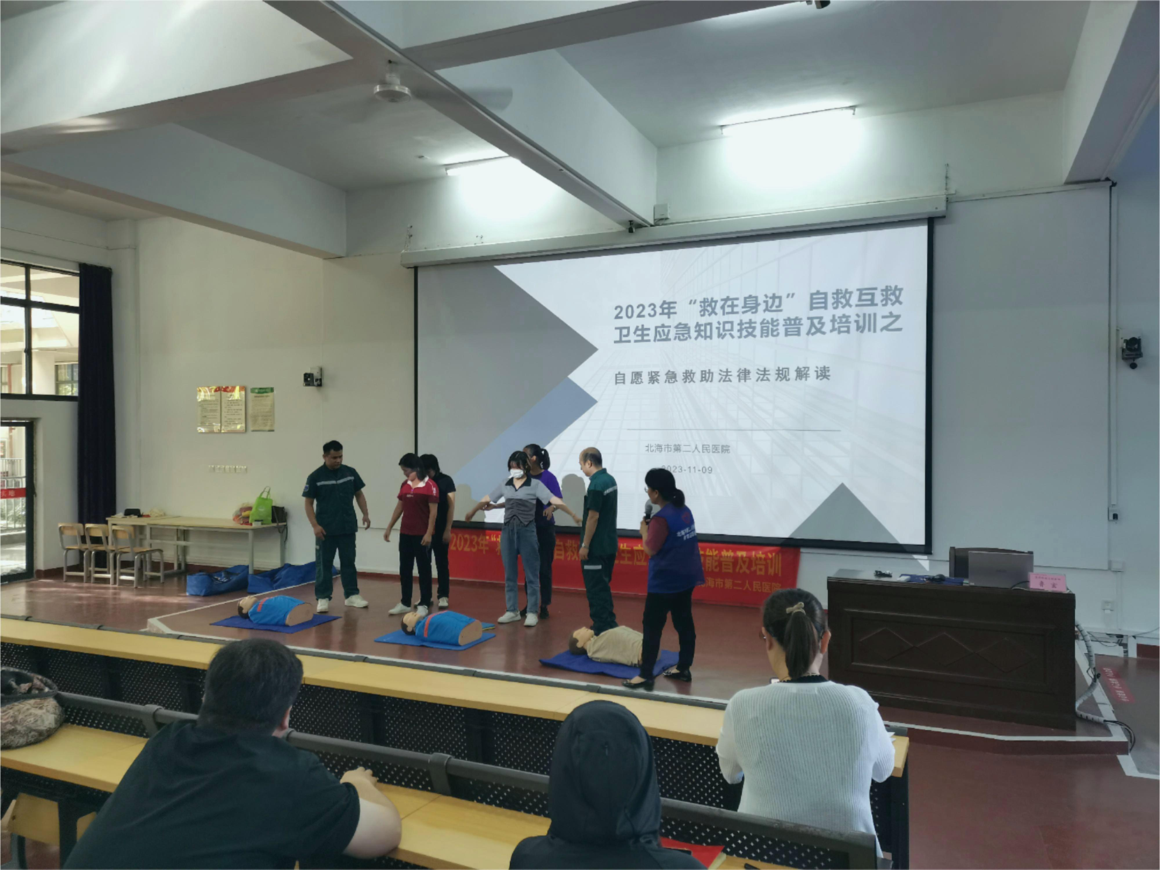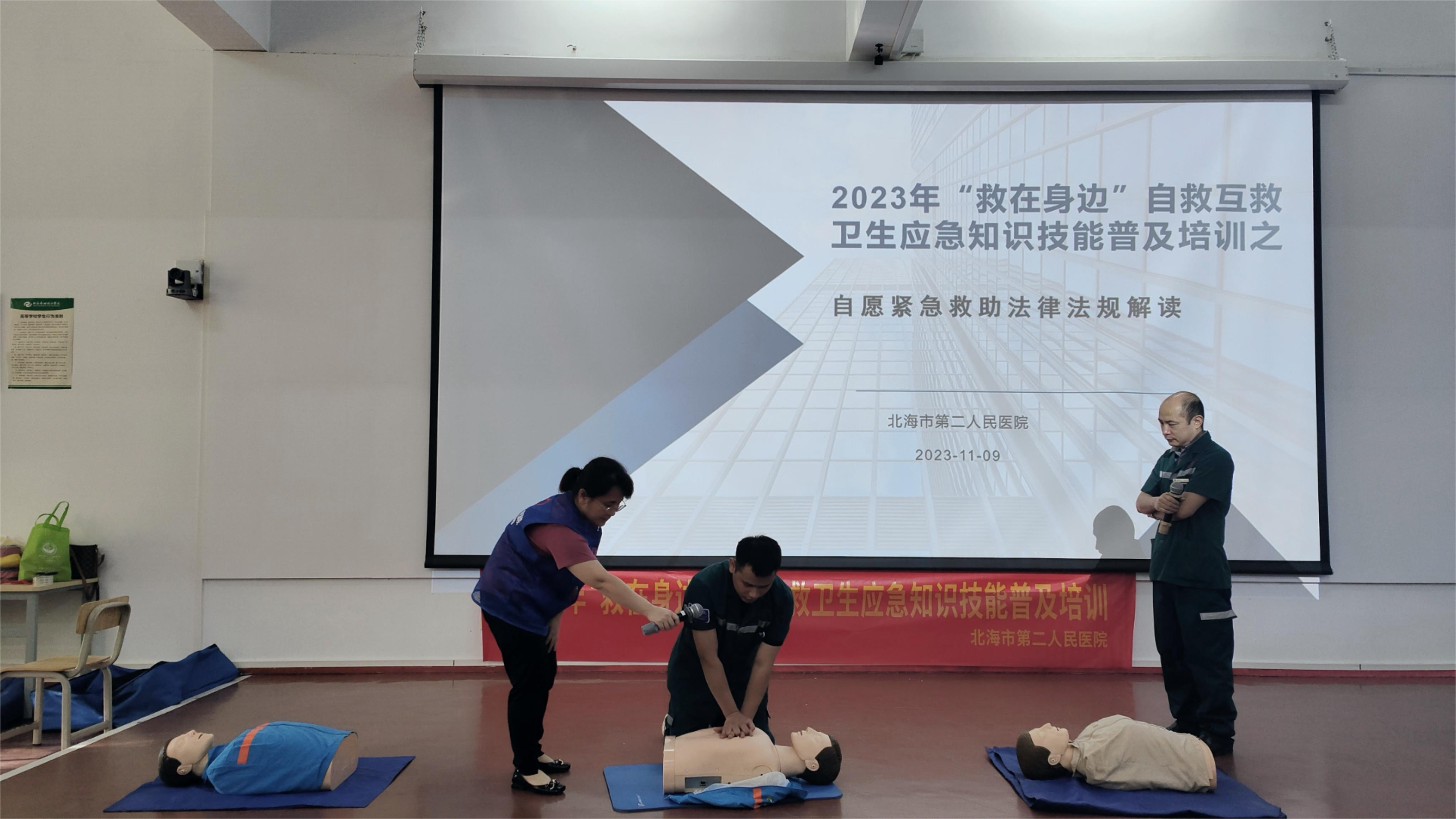 随着现代社会的发展,人们新的生活模式结构下,在生产、学习、生活环境中发生的危重急症、意外伤害愈来愈屡见不鲜,为提高我校教职员工的急救意识与现场急救能力,11月9日下午,我校组织开展自救互救卫生应急知识技能培训。培训由周晓敏老师主持,北海市第二人民医院的鲁玄主任、黄焱医生及蒙春良主管护师分别进行了应急救护知识讲授,并现场演示了心肺复苏术、气道阻塞的现场急救、创伤止血包扎技术及实操指导。通过此次应急救护知识技能培训,加强了我校教职工对急救技能的了解,也为我校应对突发事件,及时、有效开展现场救护积累了经验。