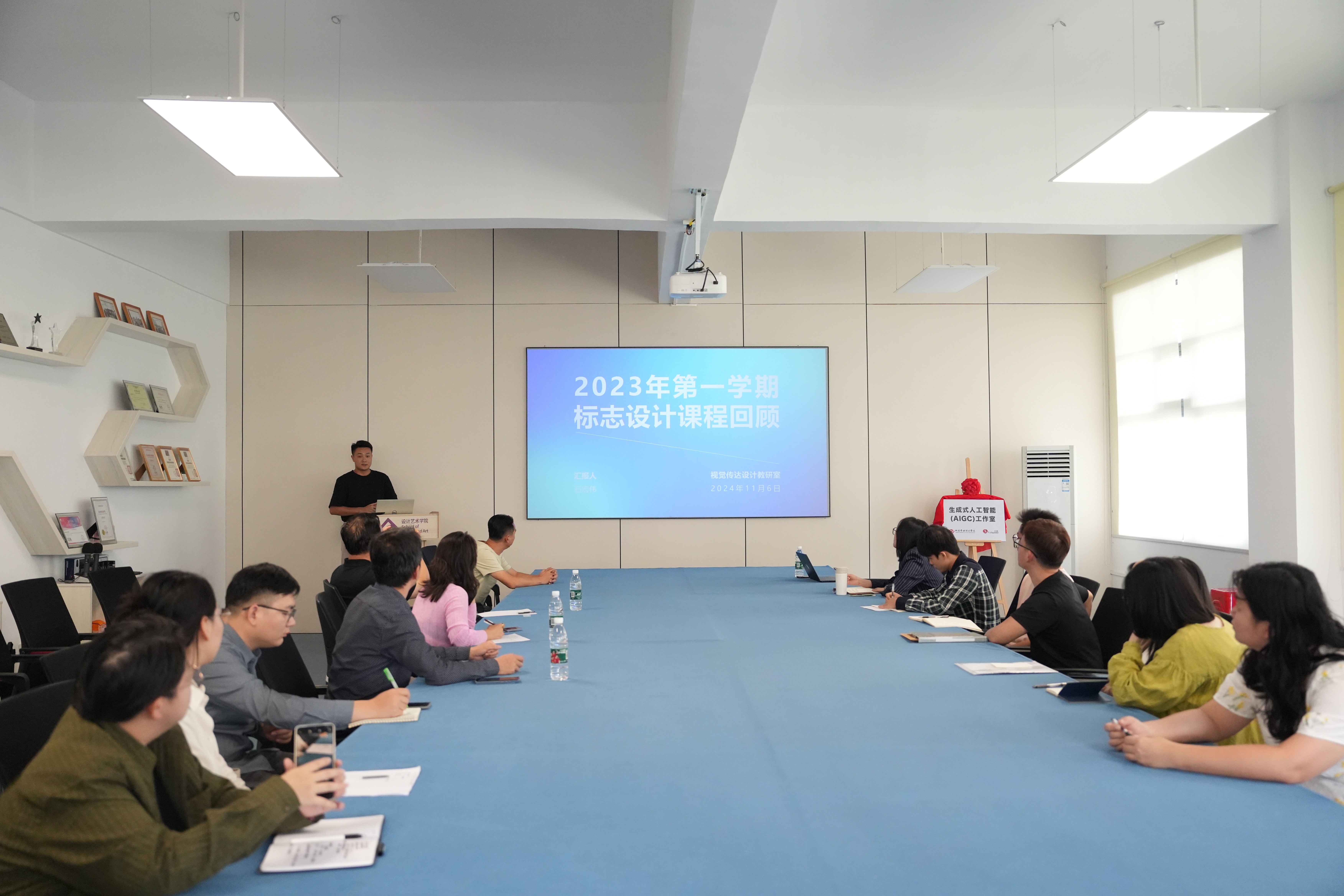 随后,教研室副主任石宏伟,作为2023-2024(一)学年标志设计课程的主课教师,通过课程设置、命题布置以及优秀作业的展示,全面总结了该学年的标志设计课程成果,突出了课程的实践性和创新性。