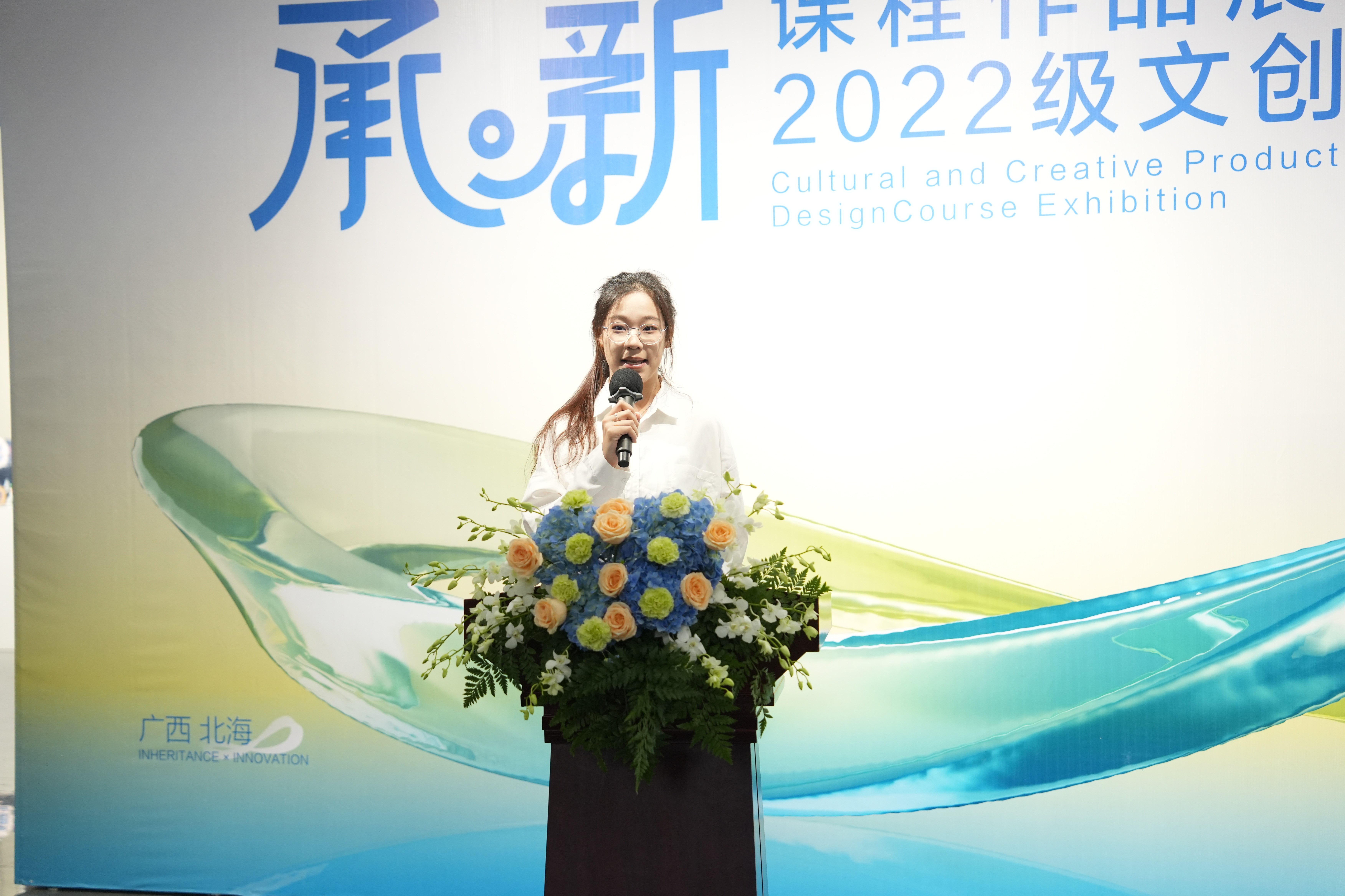 随后,文创产品设计课程主课老师吴慧霞上台发言,她对学生们的创意和努力给予了高度评价,并强调了教育在培养学生创新思维和实践能力中的重要作用。同时,学院将继续推动产教融合、校企合作,拓展更多的实践机会和展示平台,为同学们提供深入社会、体验生活的机会。