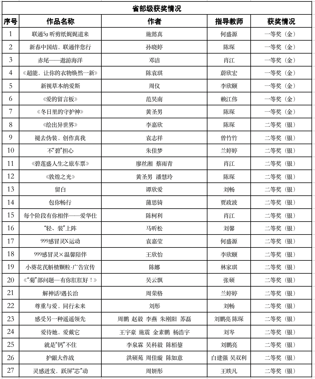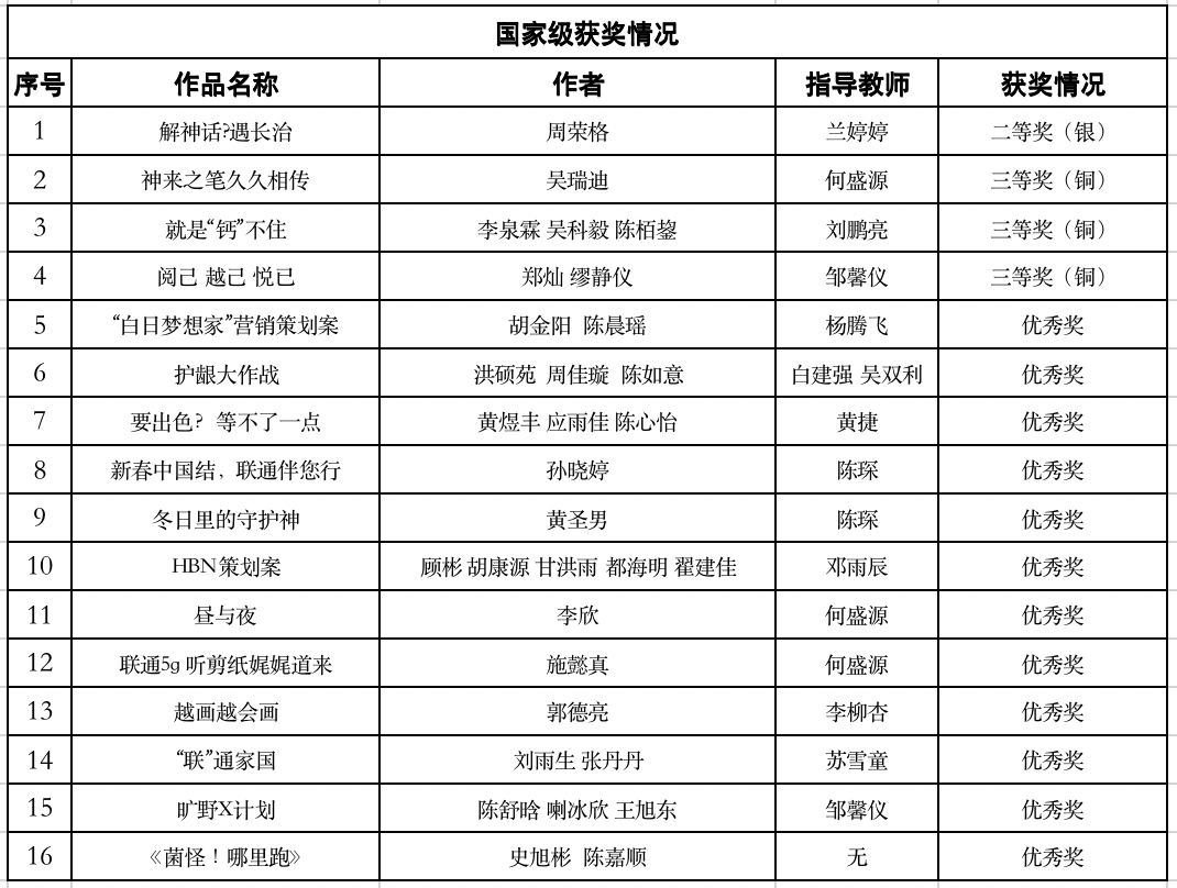 第十六届全国大学生广告艺术大赛颁奖典礼在北京顺利举行。在这场创意与智慧的激烈碰撞中,我院视觉传达专业的学子们在老师的指导下,力克群雄,荣获国赛共16项,其中二等奖1项,三等奖3项,优秀奖12项;省赛共59项,其中一等奖7项,二等奖23项,三等奖29项,为学校再添辉煌!