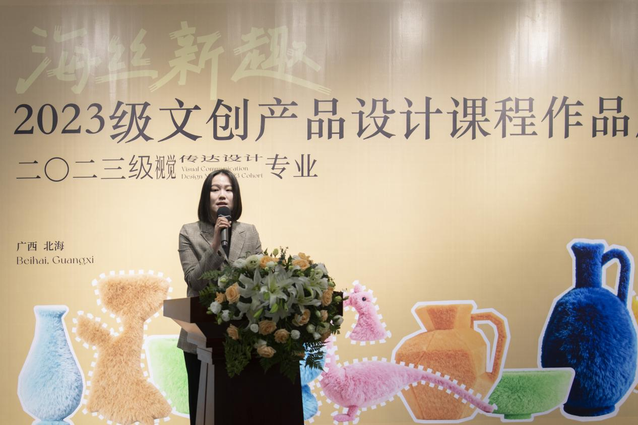 课程教师代表刘馨回顾了课程从选修课发展为校级一流课程及课程思政示范课的历程。她指出,依托“馆—校—企”协同育人平台,课程不断强化教学内容的实践性与前瞻性,推动学生作品从概念构思走向产品落地,部分成果已实现IP转化并投入市场,充分体现了“教、学、做、创”一体化的育人成效。