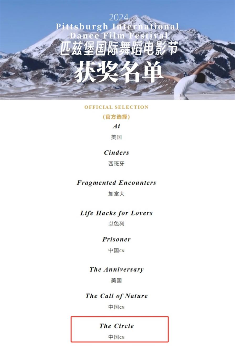 近日,我校舞蹈表演专业与摄影专业联合创作的舞蹈影像作品《The Circle》(中文名:《渡》)在2024匹兹堡国际舞蹈电影节中获奖。该作品同时入围2024北京国际电影节和西班牙·春天舞蹈电影节等多个国际电影节舞蹈影像环节。