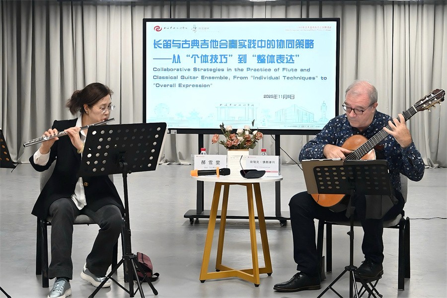 11月5日,法国著名古典吉他演奏家埃瑞克・佛朗塞利与旅法长笛演奏家郝雪雯女士受邀莅临我校,以“长笛与吉他合奏实践中的协同策略——从个体技巧到整体表达”为主题,为学校师生开展了一场兼具专业深度与艺术魅力的交流研讨活动。