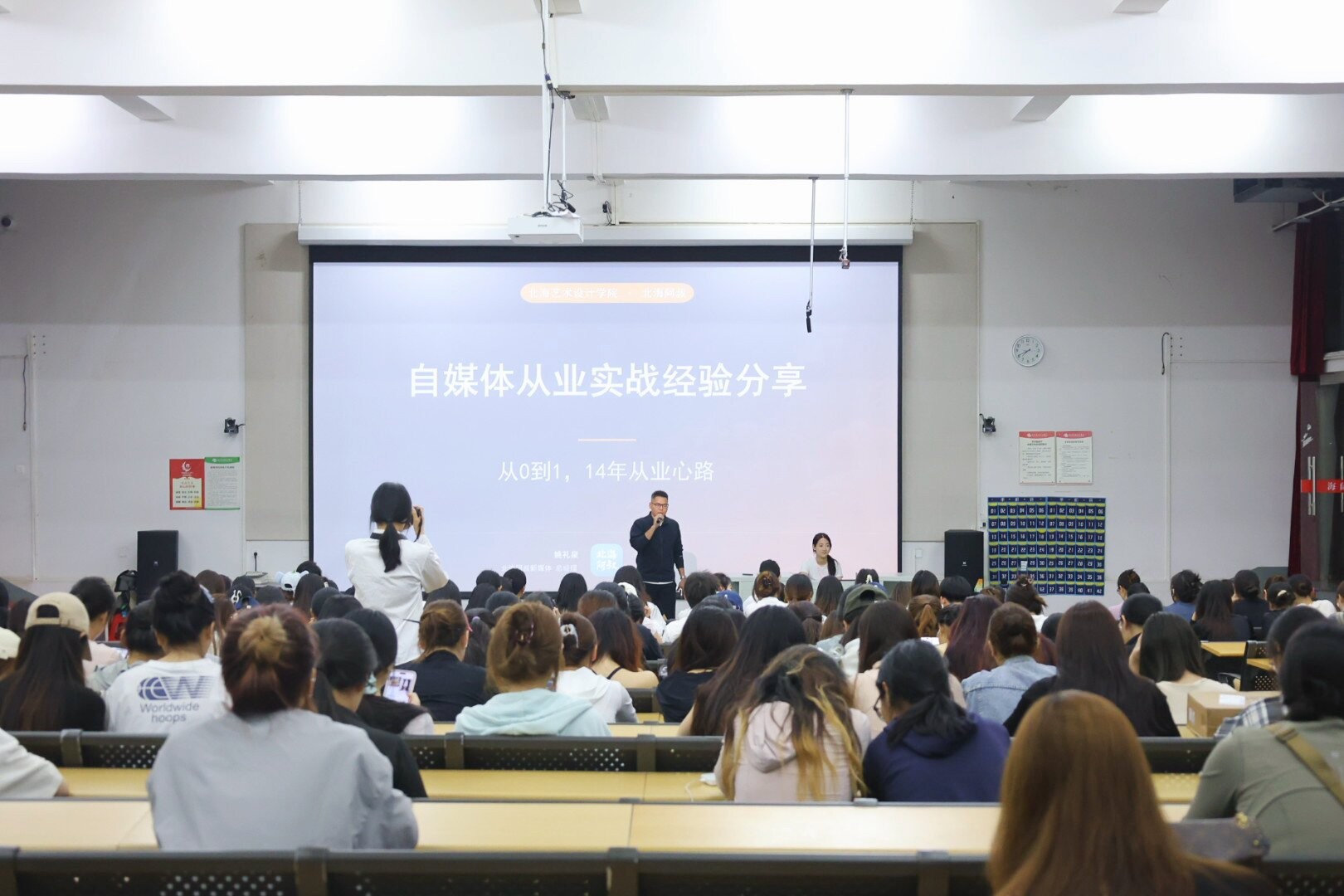 互动问答环节,现场学生就赴北京实习选择、新媒体创业筹备、教育机构入职要求、职业规划制定等问题积极提问,两位嘉宾耐心倾听并结合行业实际给予针对性解答,为学生破解职业发展困惑、理清创就业思路。