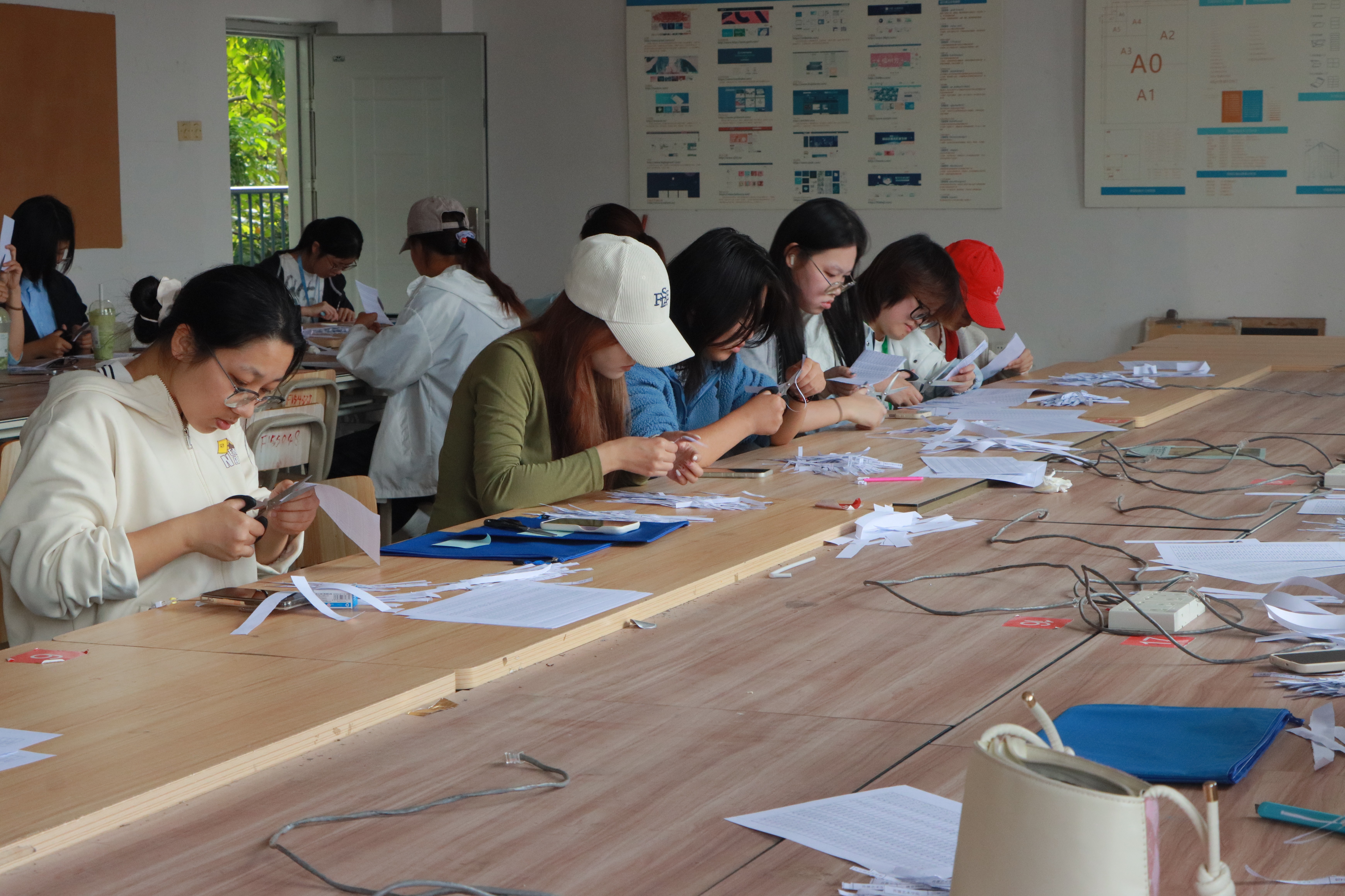 现场,每位同学都全神贯注,小心翼翼地裁剪着手中的信息条。