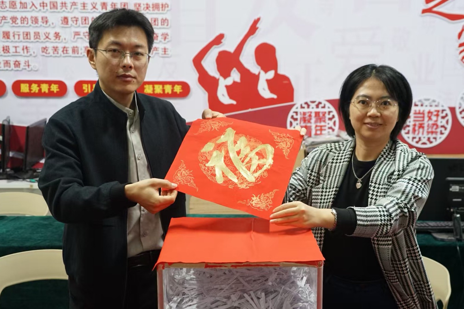 12月20日,2026年元旦晚会抽奖活动封箱仪式在行政楼118顺利开展,参加本次封箱仪式的老师有:学生工作部(处)部长班媚,纪检办公室主任、传媒艺术学院党总支书记王明森。